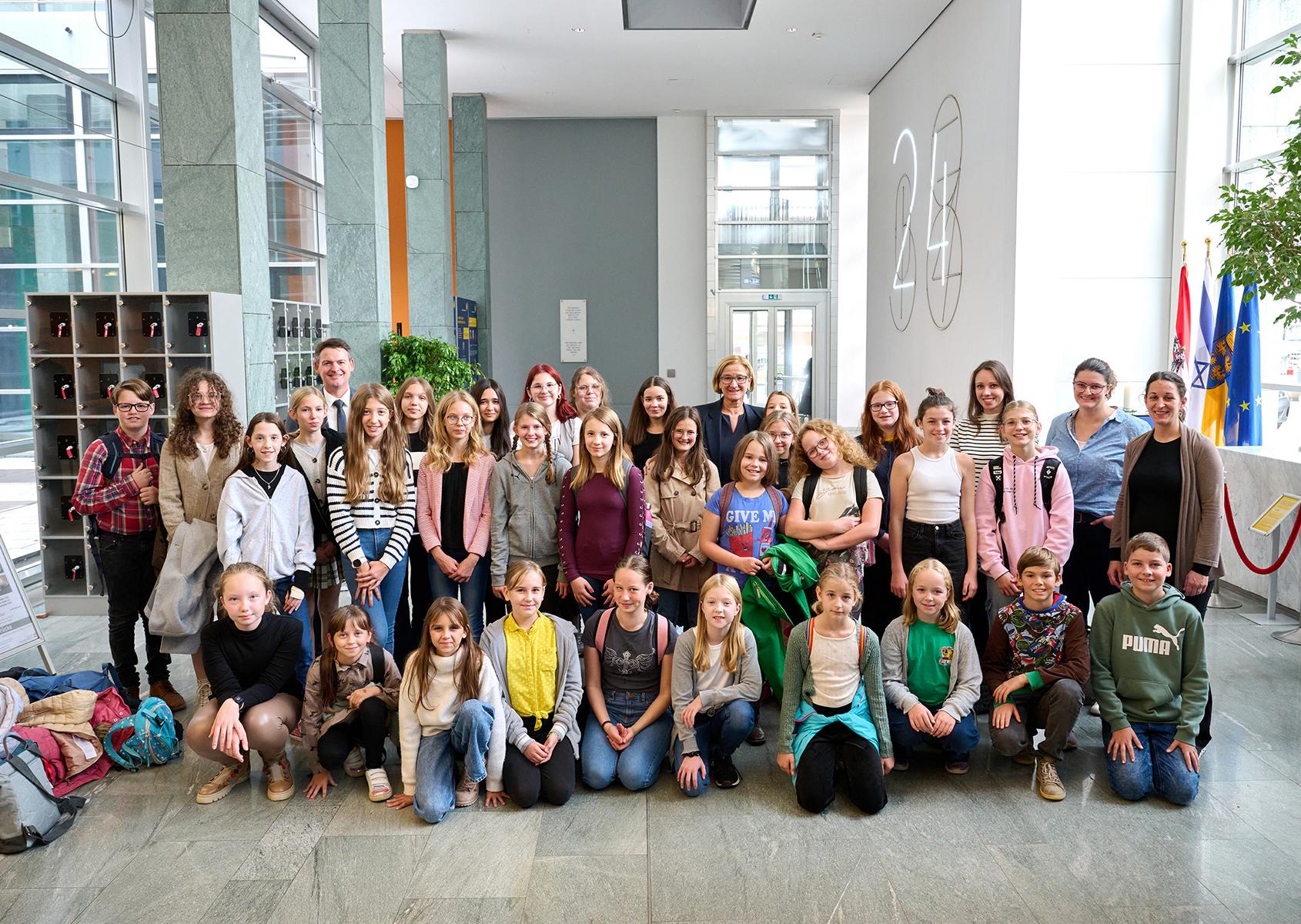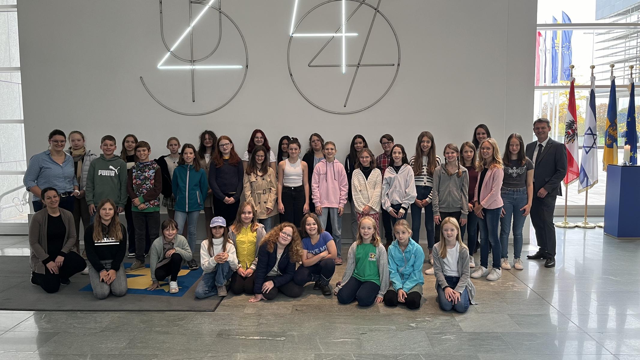 Nach einem erfolgreichen Auftritt bei der Angelobung des neuen Bezirkshauptmannes Mag. Stefan Grusch wurde der Schulchor unter der Leitung von MMag. Stephanie Stift, MA von Landeshauptfrau Johanna Mikl-Leitner am 25.10.2023 ins Landhaus St. Pölten eingeladen. Nach der Begrüßung durch die Landeshauptfrau und den Abgeordneten zum NÖ Landtag Franz Linsbauer sang der Schulchor ein Ständchen. Danach wurde der Klangturm, das Haus der Geschichte sowie das Haus der Natur besucht. Außerdem konnten sich die Kinder auf Einladung der Landeshauptfrau bei einem Mittagessen im Regierungsviertel stärken.