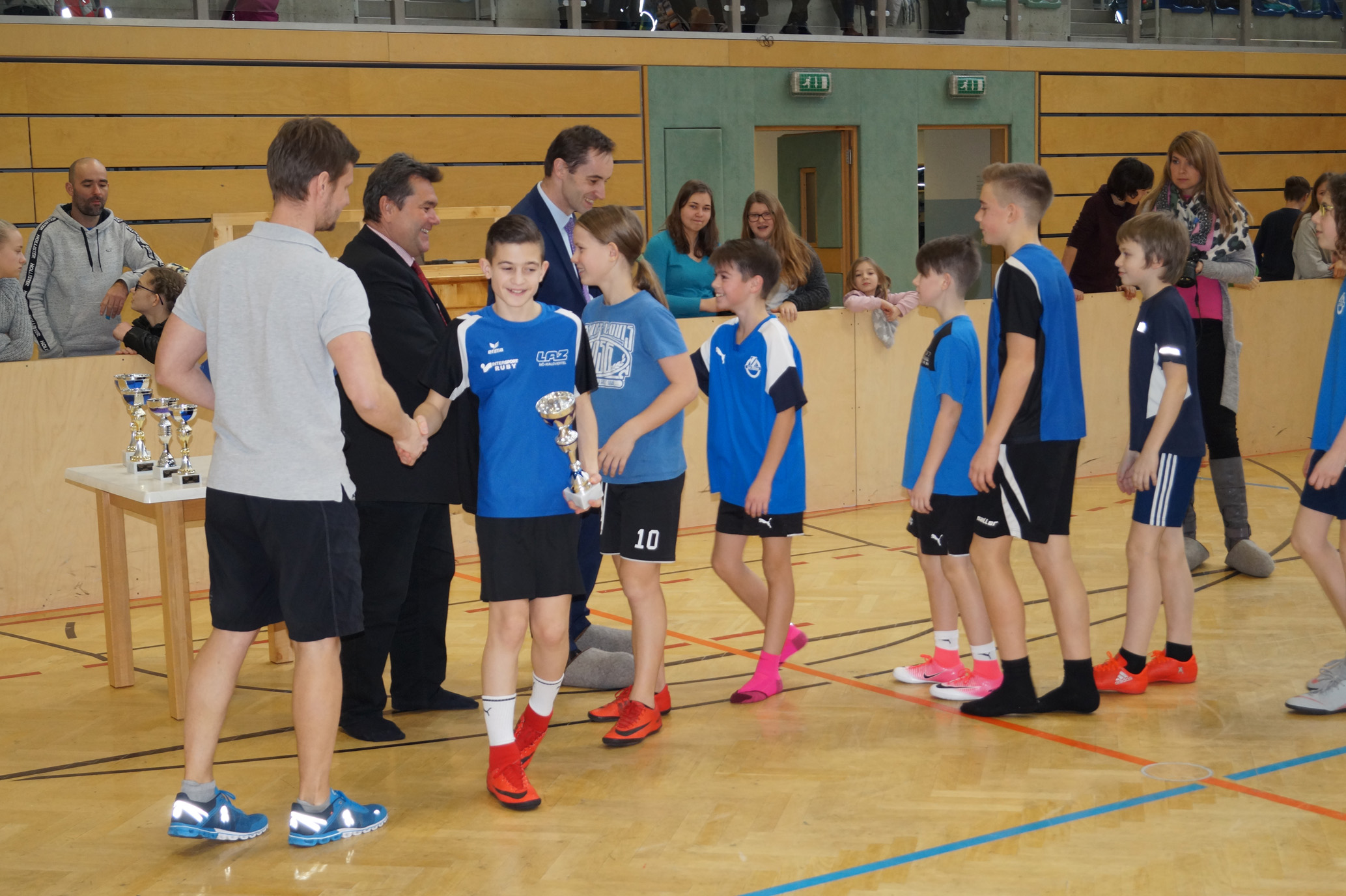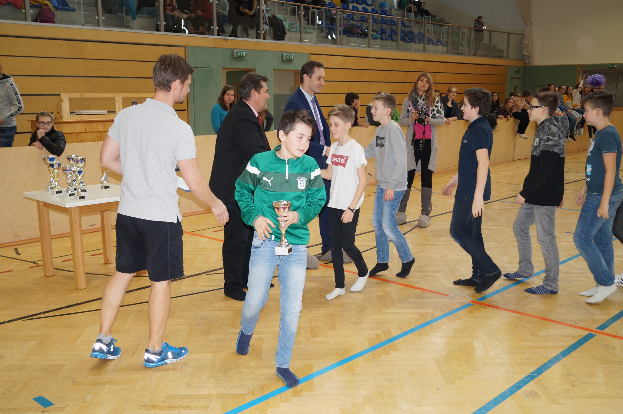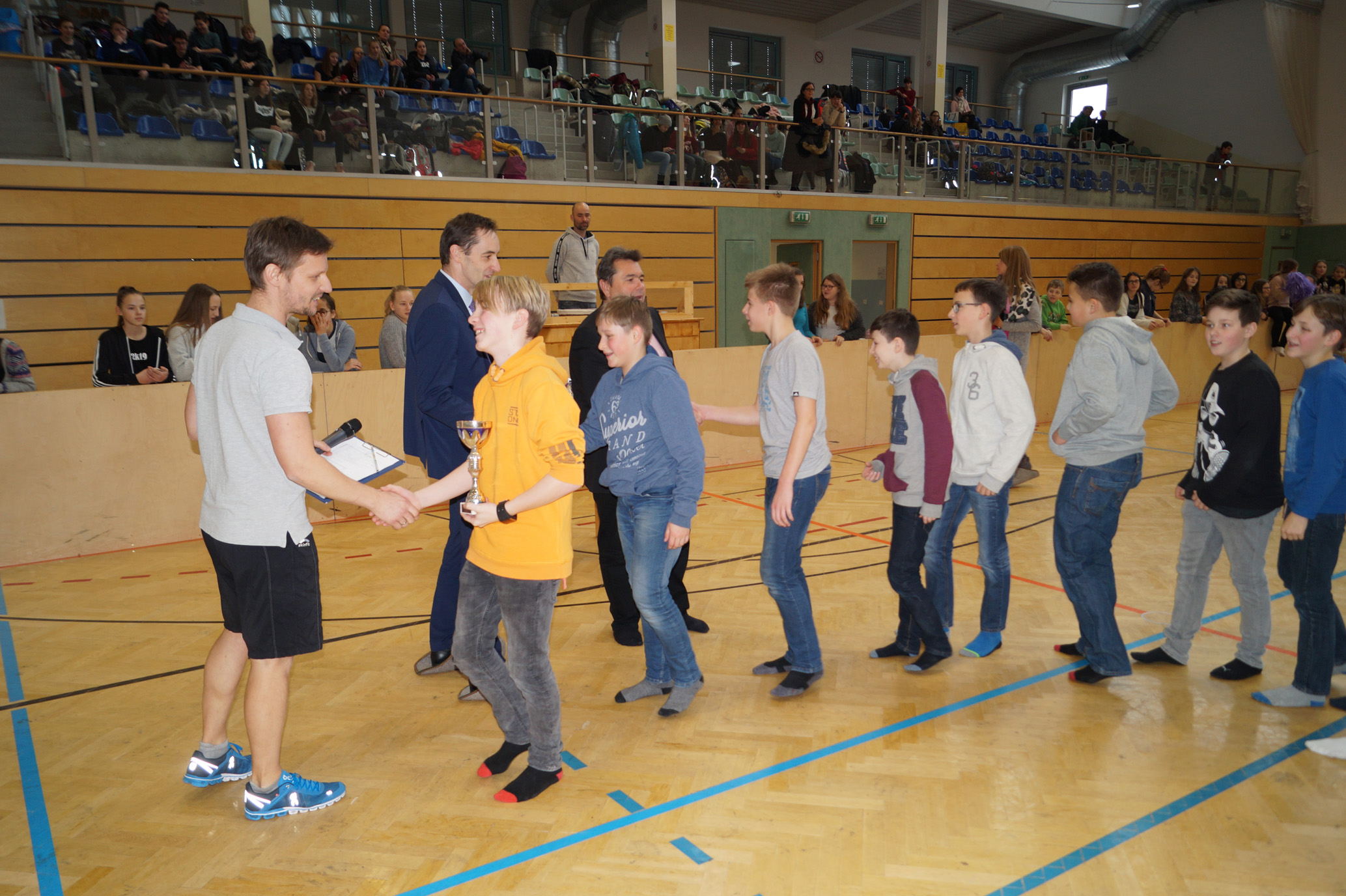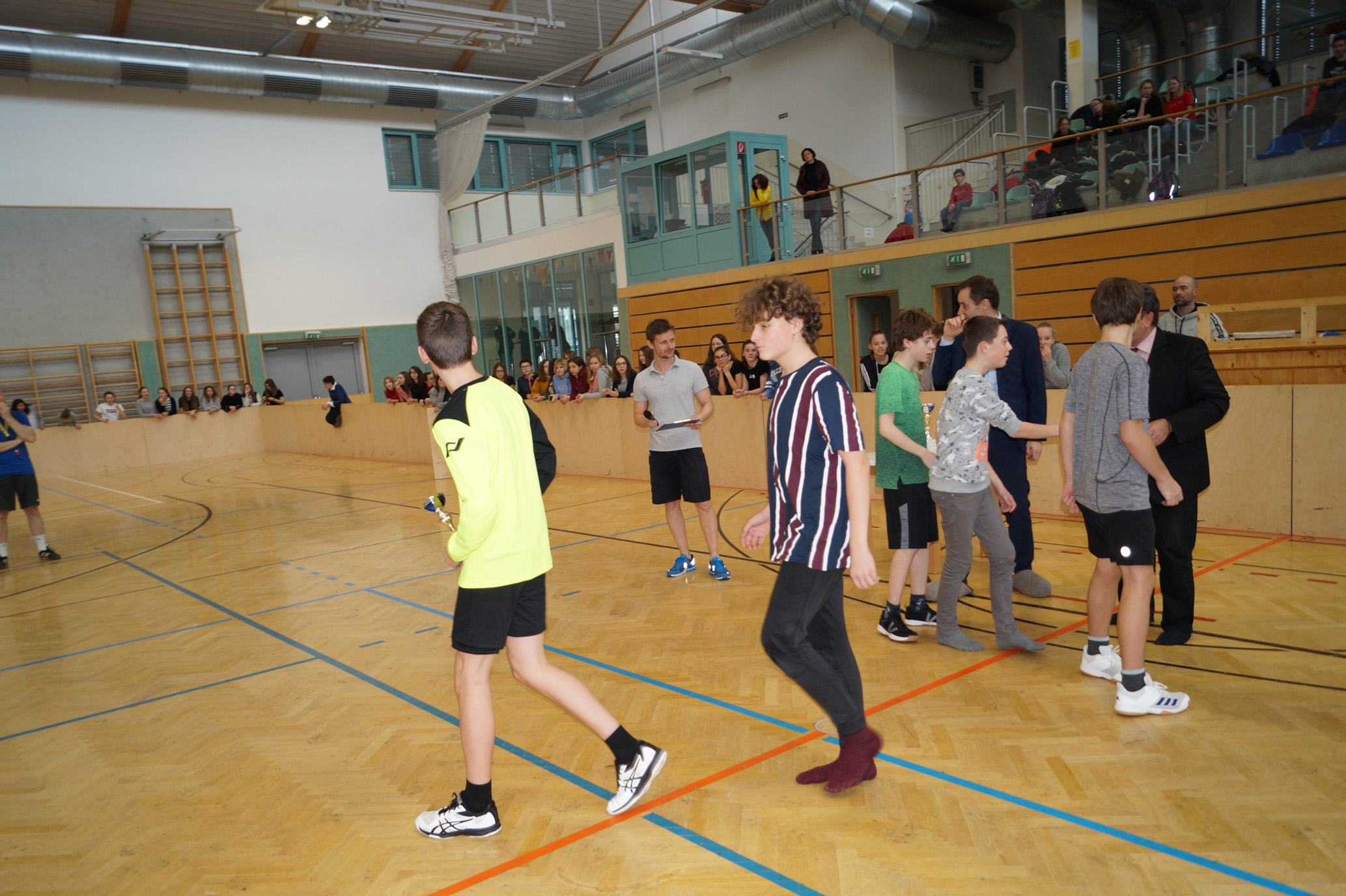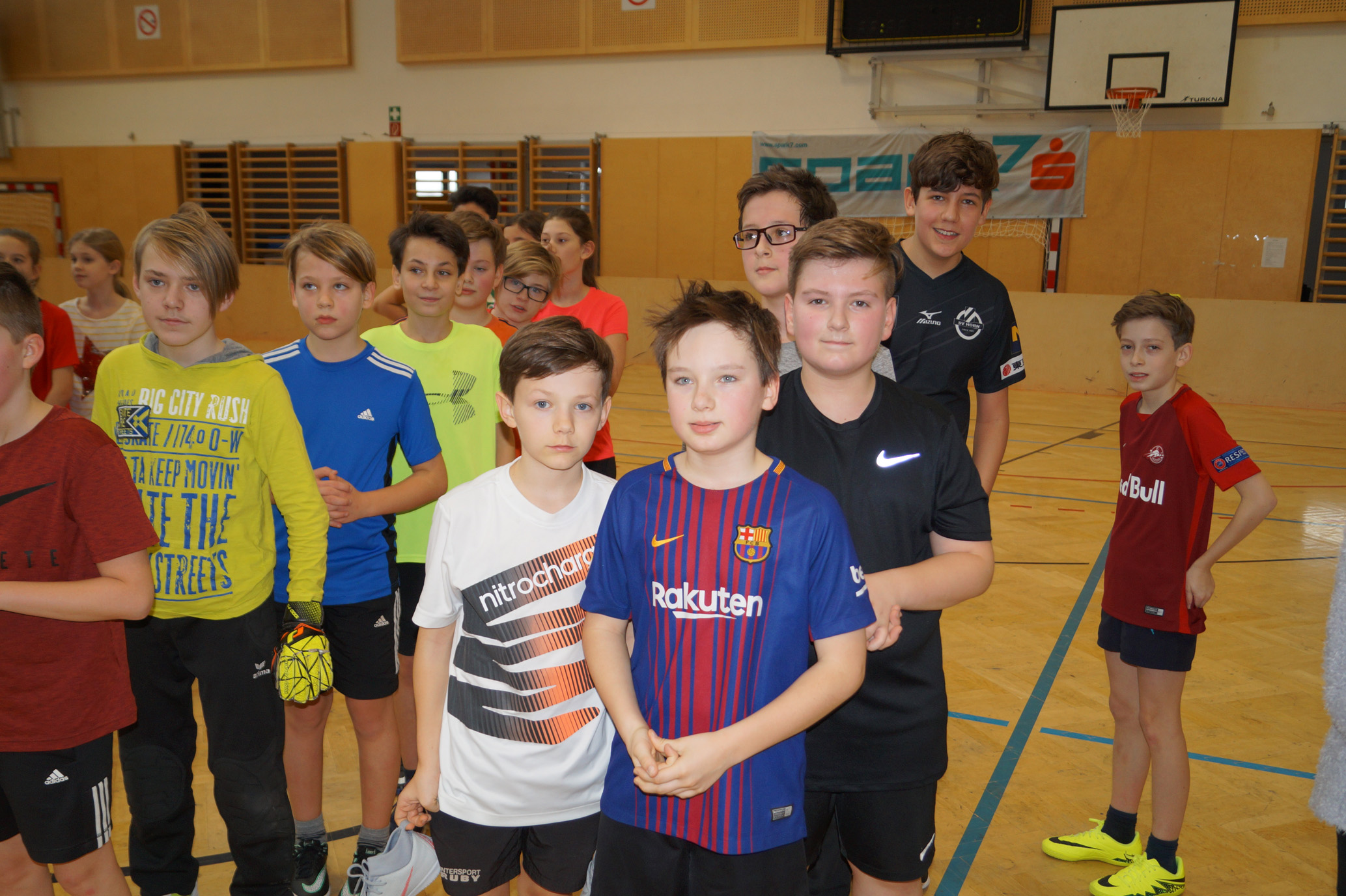 Jede Unterstufenklasse war von Organisator Mag. Herbert Schöchtner eingeladen eine Mannschaft für das Turnier aufzustellen, und das haben auch alle Klassen mit großem Eifer getan. So spielten 148 Schülerinnen und Schüler des BG Horn um den Sieg. Die Moderation übernahm Mag. Mathias Gabler und Mag. Christoph Führer war Schiedsrichter. Nach dem Prinzip „jeder gegen jeden“ spielte jede Klasse einmal gegen jede andere Mannschaft derselben Schulstufe. Für jede Schulstufe wurden vier Pokale vergeben, die von der Sparkasse gesponsert wurden, also gab es auch für alle Platzierungen einen Pokal. Bei den ersten Klassen durfte die 1a jenen für den 1. Platz mit in die Klasse nehmen, bei den zweiten Klassen die 2b. Bester Spieler wurde Thierry Tazemeta (2b) und Kimmi Schönweiß (2d) wurde zum besten Tormann gekürt. Weiters durften sich die 3a und die 4bc als erstplatzierte Sieger feiern. Thomas Popp (3a) nahm sich mit 10 Treffern den Pokal für den Torschützenkönig mit nachhause.