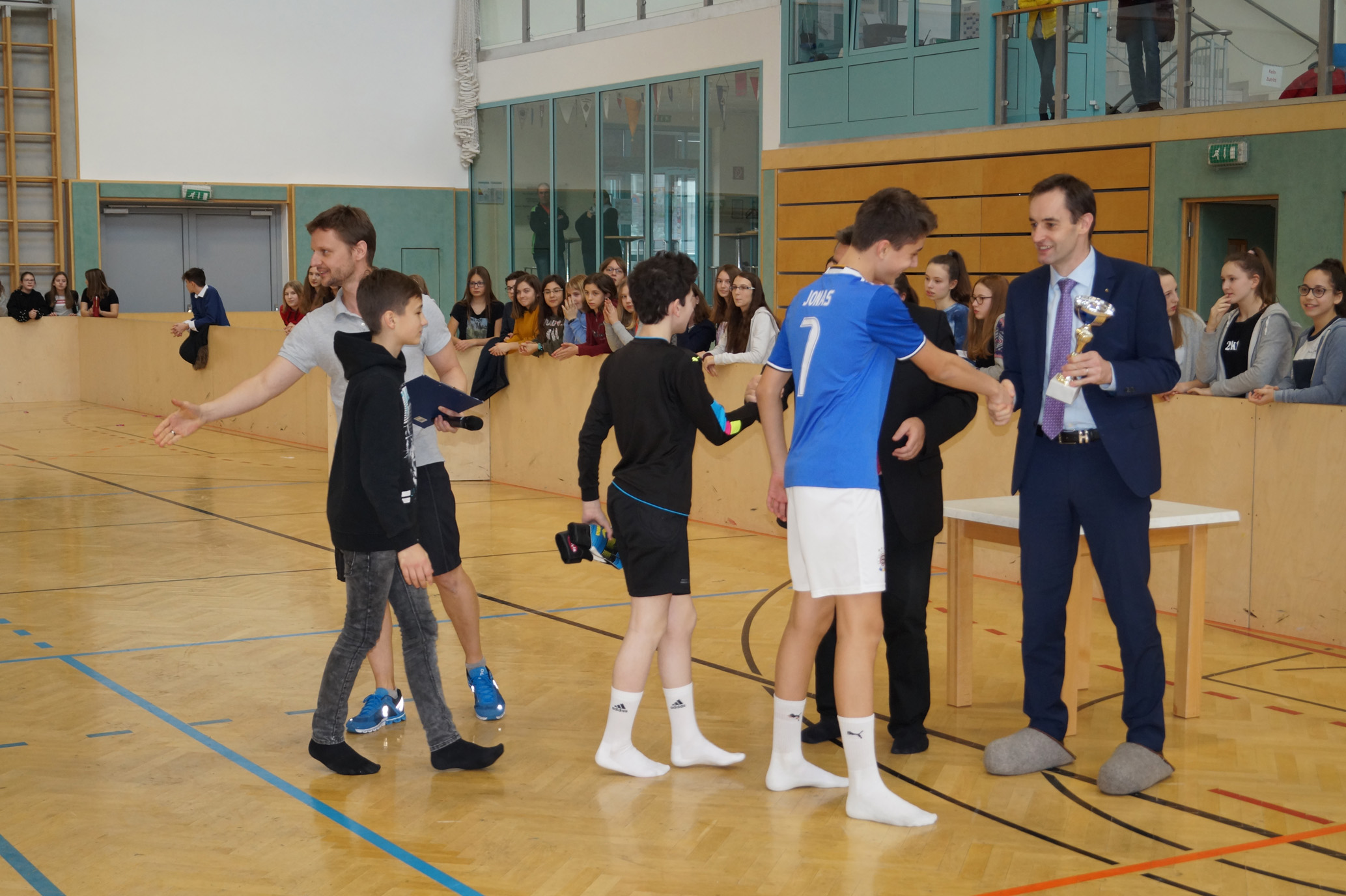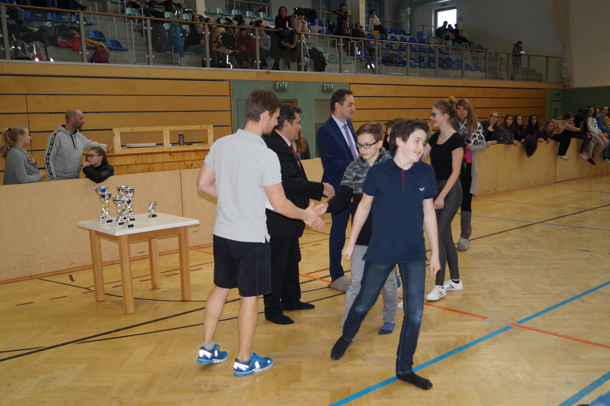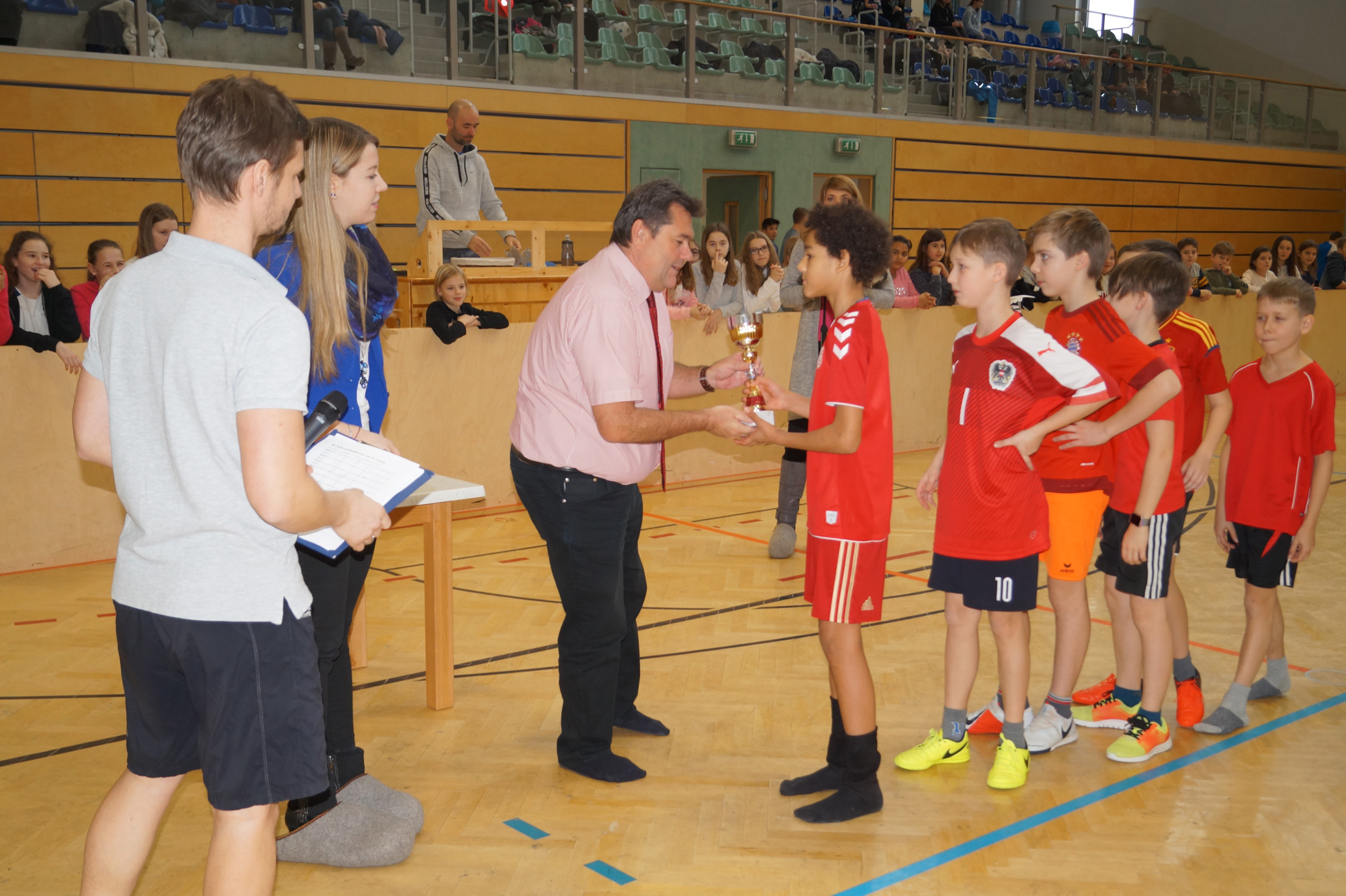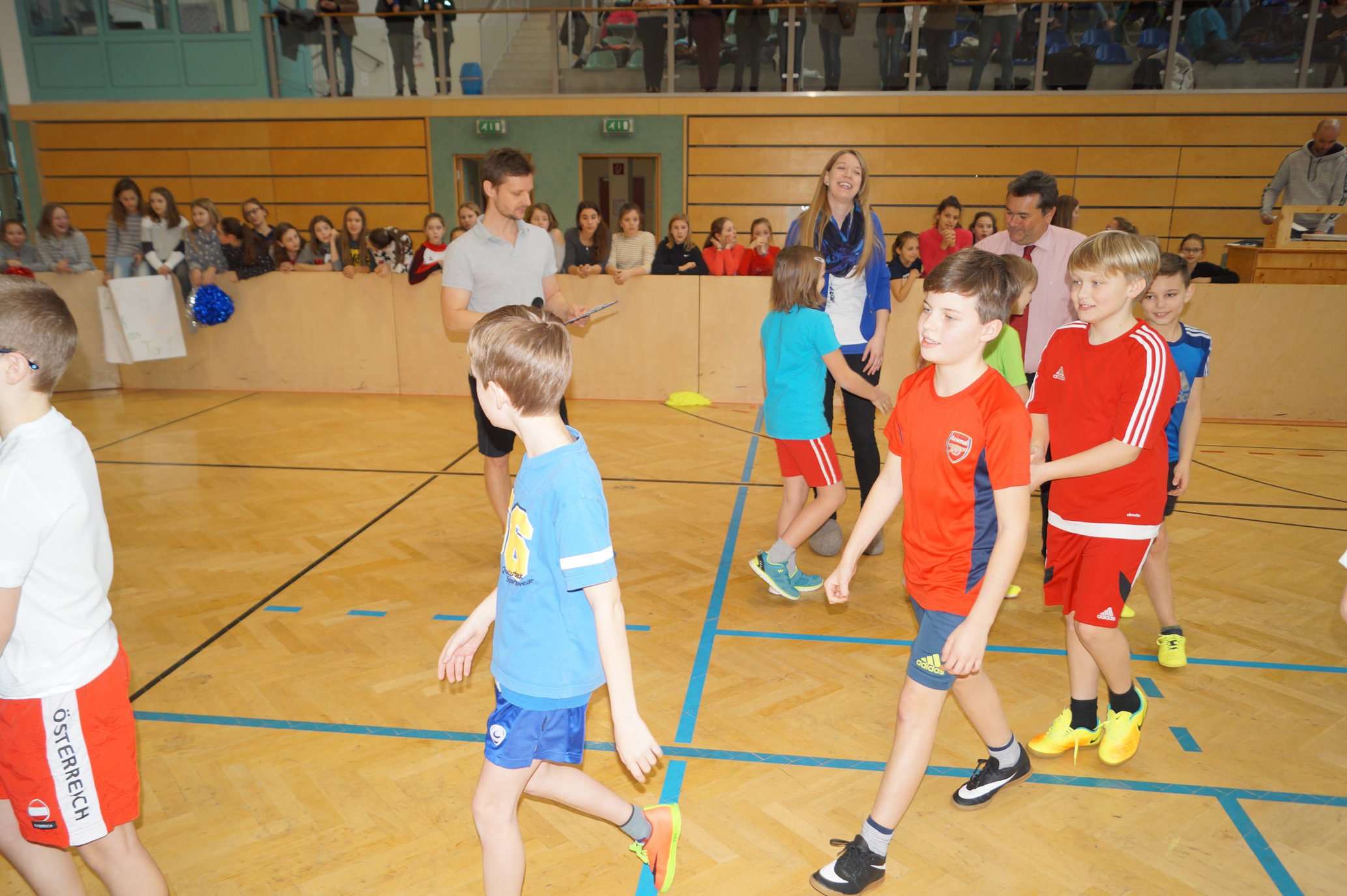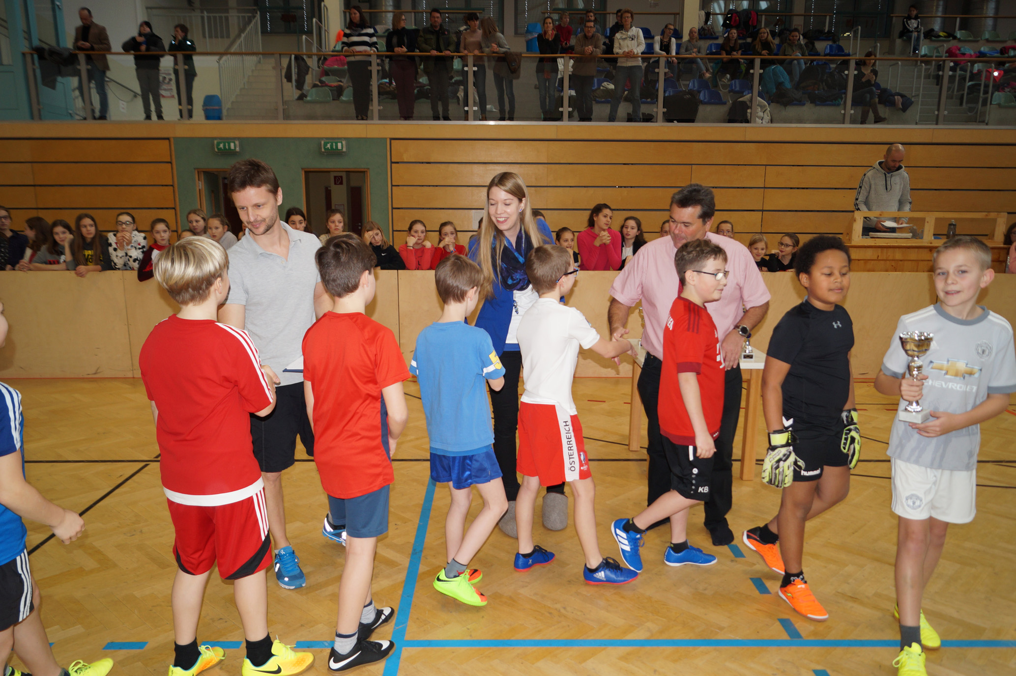 Jede Unterstufenklasse war von Organisator Mag. Herbert Schöchtner eingeladen eine Mannschaft für das Turnier aufzustellen, und das haben auch alle Klassen mit großem Eifer getan. So spielten 148 Schülerinnen und Schüler des BG Horn um den Sieg. Die Moderation übernahm Mag. Mathias Gabler und Mag. Christoph Führer war Schiedsrichter. Nach dem Prinzip „jeder gegen jeden“ spielte jede Klasse einmal gegen jede andere Mannschaft derselben Schulstufe. Für jede Schulstufe wurden vier Pokale vergeben, die von der Sparkasse gesponsert wurden, also gab es auch für alle Platzierungen einen Pokal. Bei den ersten Klassen durfte die 1a jenen für den 1. Platz mit in die Klasse nehmen, bei den zweiten Klassen die 2b. Bester Spieler wurde Thierry Tazemeta (2b) und Kimmi Schönweiß (2d) wurde zum besten Tormann gekürt. Weiters durften sich die 3a und die 4bc als erstplatzierte Sieger feiern. Thomas Popp (3a) nahm sich mit 10 Treffern den Pokal für den Torschützenkönig mit nachhause.