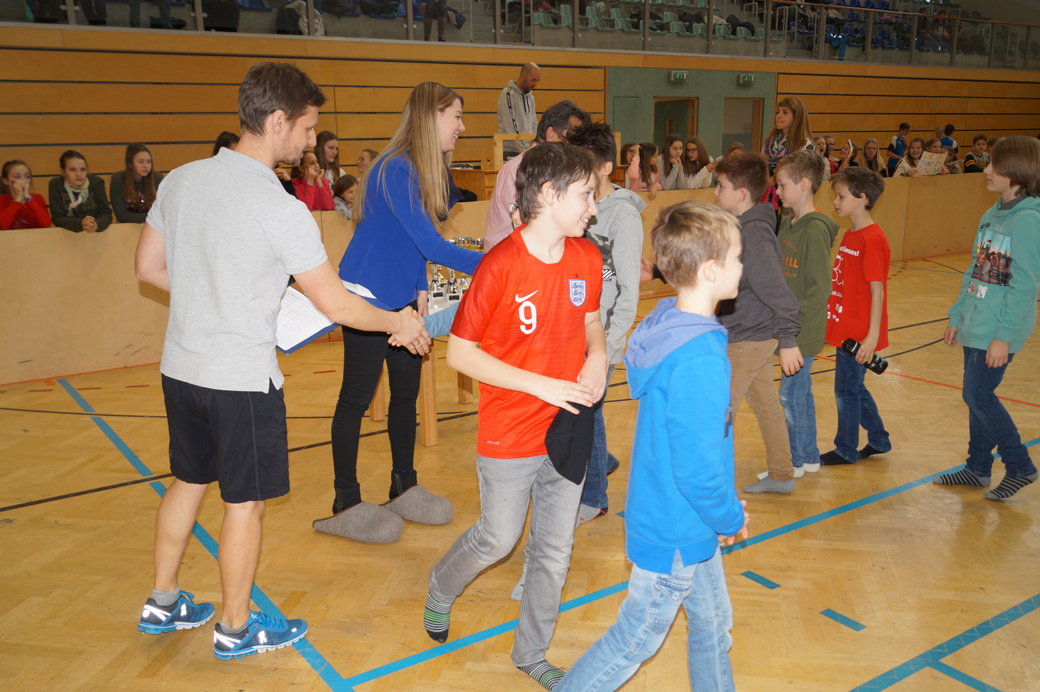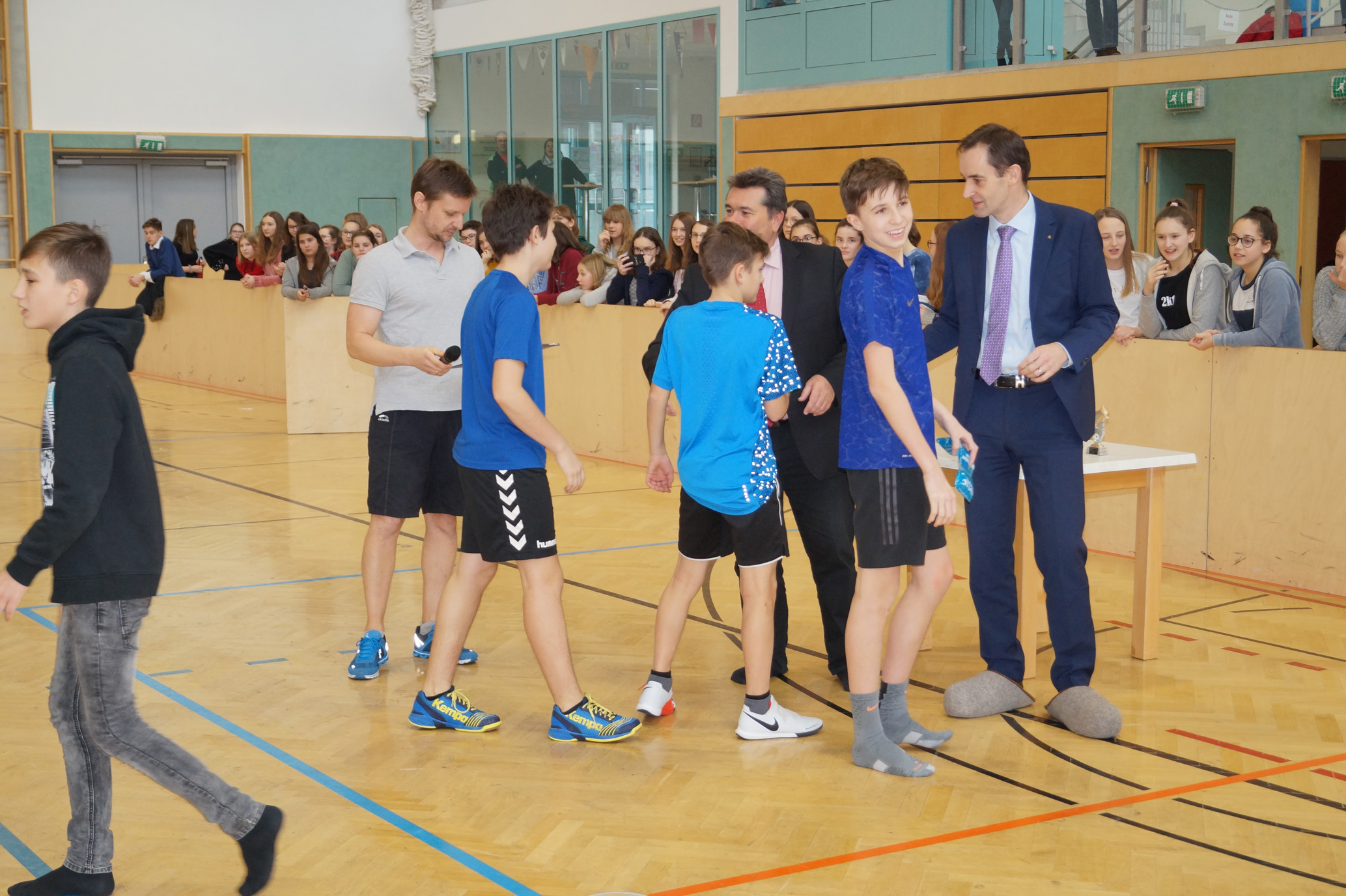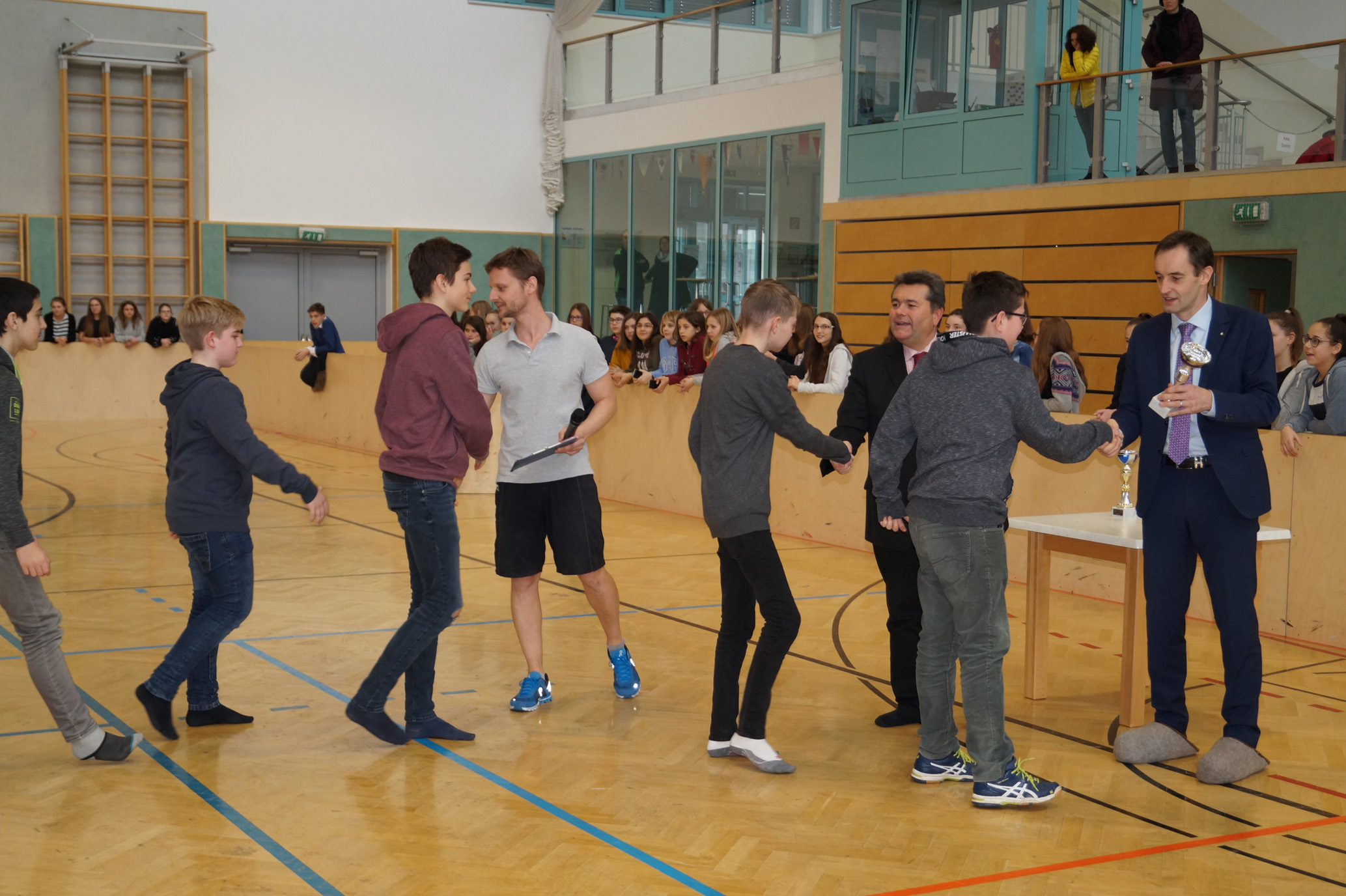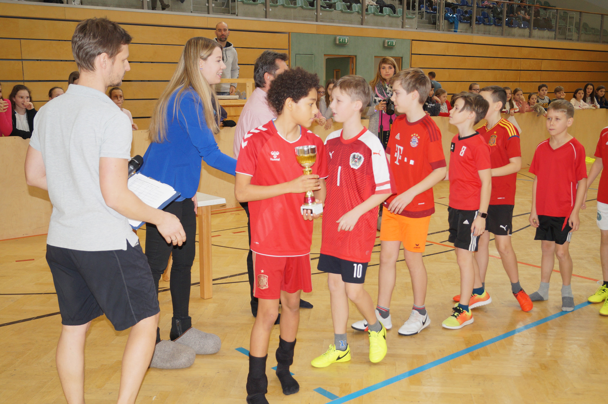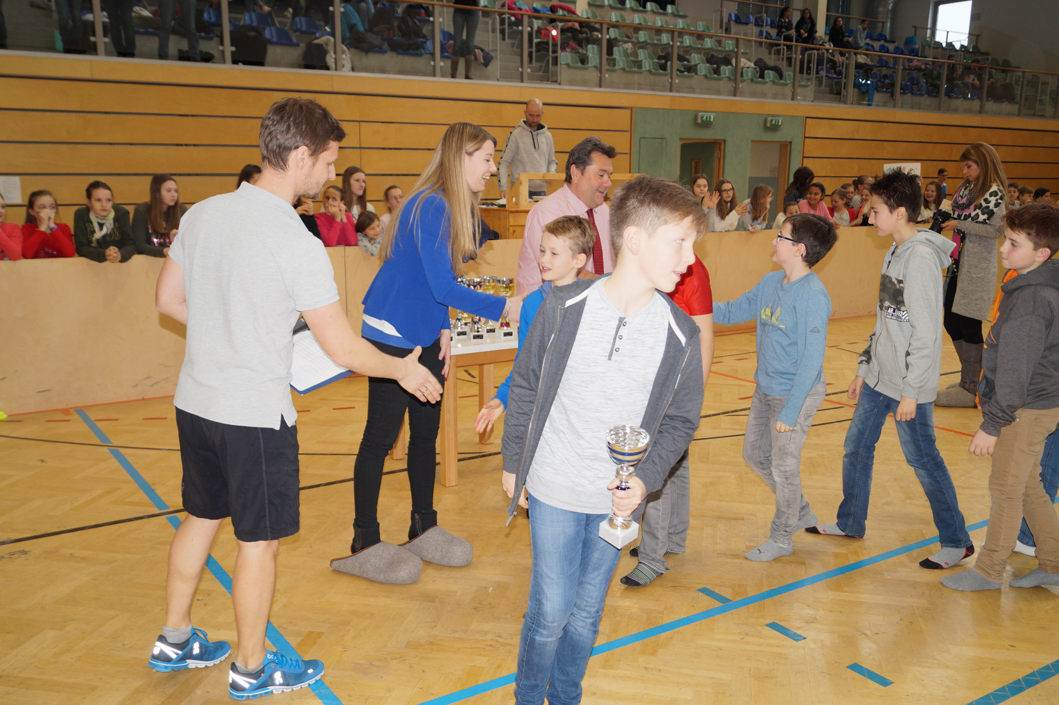 Jede Unterstufenklasse war von Organisator Mag. Herbert Schöchtner eingeladen eine Mannschaft für das Turnier aufzustellen, und das haben auch alle Klassen mit großem Eifer getan. So spielten 148 Schülerinnen und Schüler des BG Horn um den Sieg. Die Moderation übernahm Mag. Mathias Gabler und Mag. Christoph Führer war Schiedsrichter. Nach dem Prinzip „jeder gegen jeden“ spielte jede Klasse einmal gegen jede andere Mannschaft derselben Schulstufe. Für jede Schulstufe wurden vier Pokale vergeben, die von der Sparkasse gesponsert wurden, also gab es auch für alle Platzierungen einen Pokal. Bei den ersten Klassen durfte die 1a jenen für den 1. Platz mit in die Klasse nehmen, bei den zweiten Klassen die 2b. Bester Spieler wurde Thierry Tazemeta (2b) und Kimmi Schönweiß (2d) wurde zum besten Tormann gekürt. Weiters durften sich die 3a und die 4bc als erstplatzierte Sieger feiern. Thomas Popp (3a) nahm sich mit 10 Treffern den Pokal für den Torschützenkönig mit nachhause.