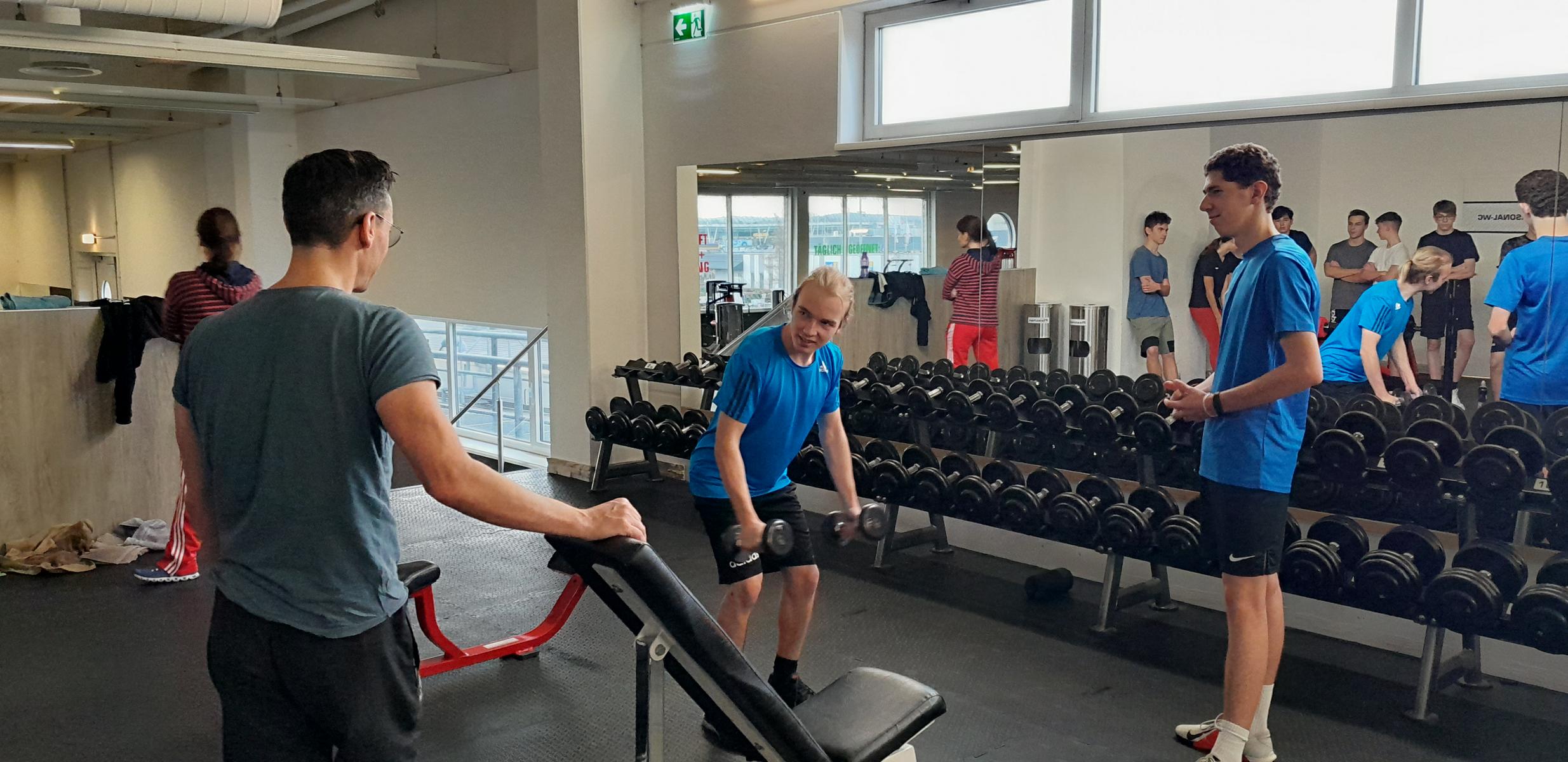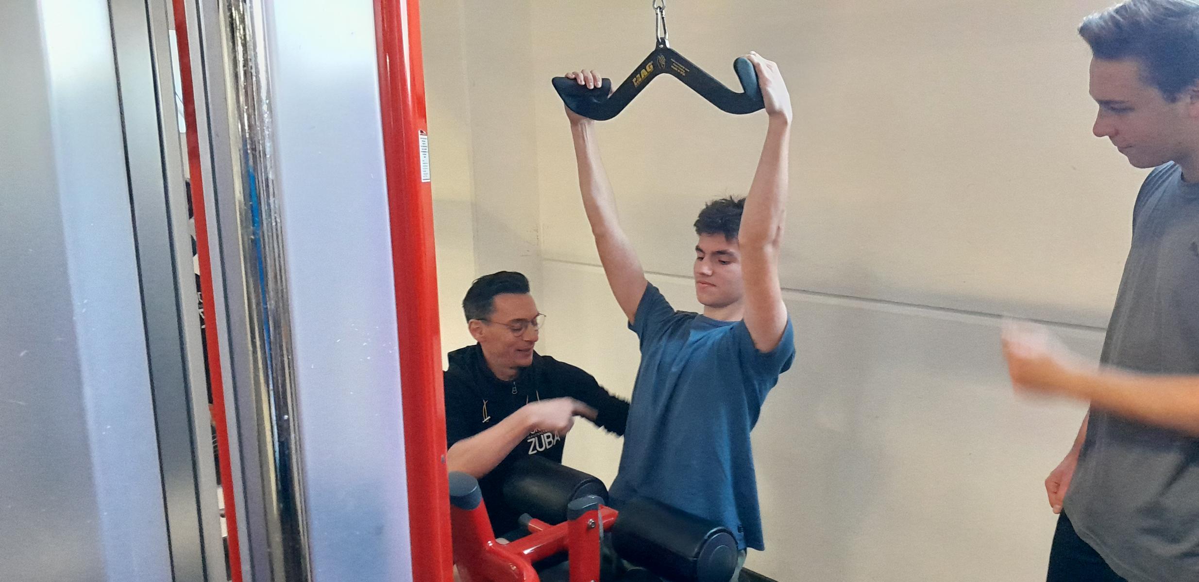 Jürgen Zuba kann auf eine 25-jährige Erfahrung im Gesundheitssport zurückgreifen. Das Hauptaugenmerk in seinem für uns zusammengestellten Training lag auf der Betrachtung der Körperhaltung. Im ersten Teil ging er dabei exemplarisch auf einzelne Schüler*innen ein und besprach individuell zu erkennende muskuläre Unausgeglichenheiten (Dysbalancen). Ganz allgemein nannte er die – aus unserem Alltag heraus – zur Abschwächung neigenden Muskelgruppen und die Methoden diese zu stärken. Im zweiten Teil ging es zu den Geräten und Hanteln, an denen die Schüler*innen, nach einer genauen Einweisung, partnerweise trainierten und sich gegenseitig in der korrekten Ausführung der Übungen unterstützten. Genauso, wie es auch professionelle Personaltrainer machen.