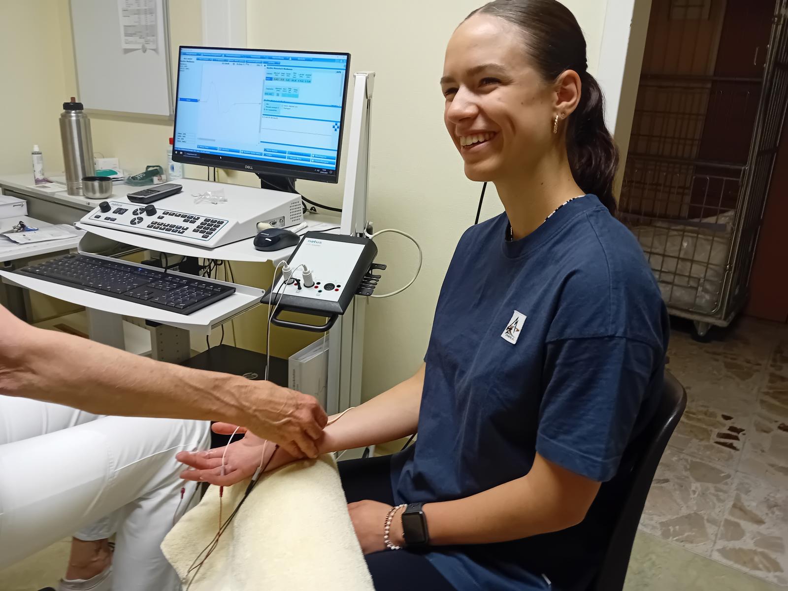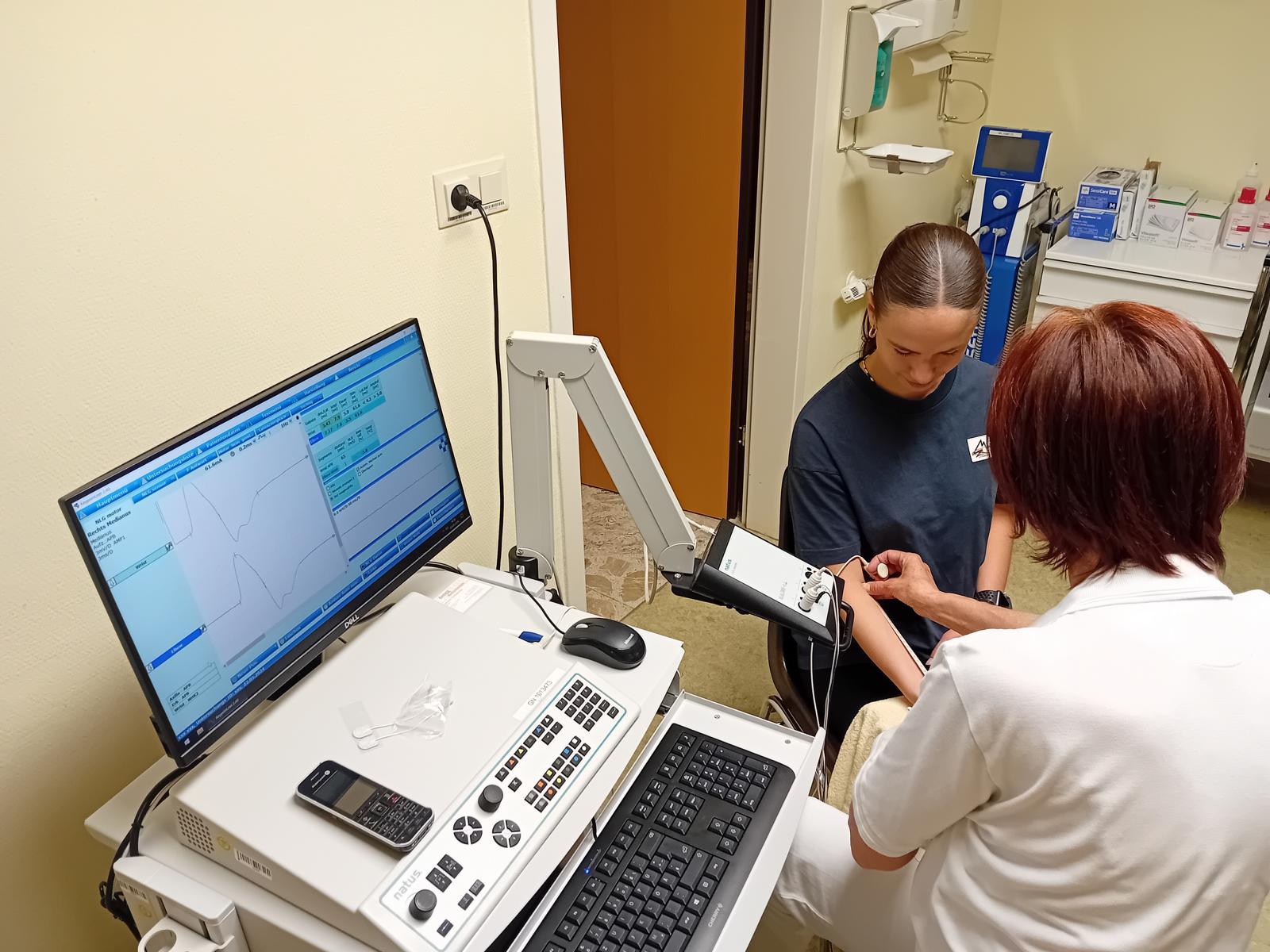 Die Demonstration einer Untersuchung am Bewegungsapparat, sowie die Messung der Nervenleitgeschwindigkeit, kombiniert mit den jeweiligen theoretischen und praktischen Hintergründen, rundeten unseren Besuch ab.