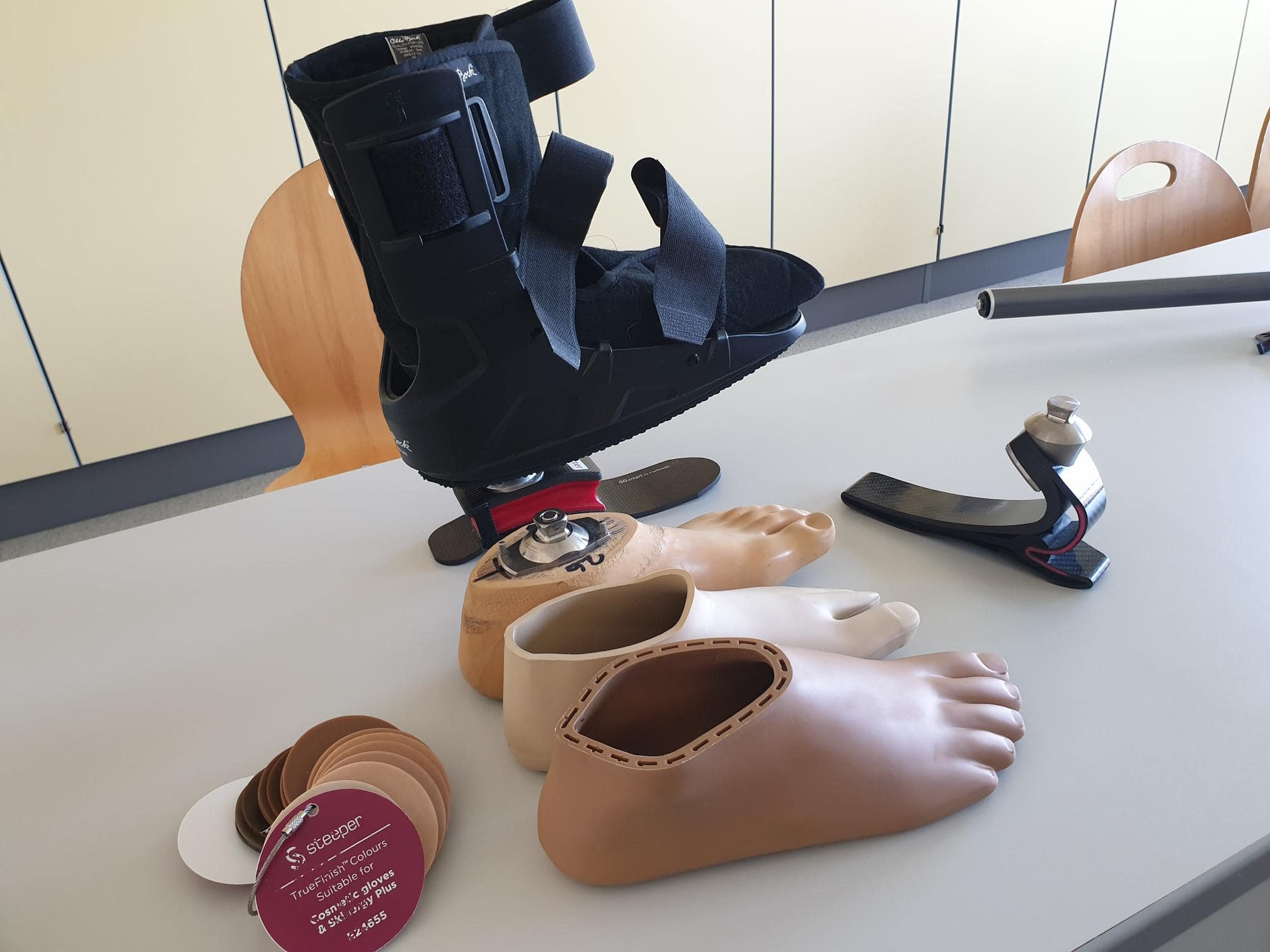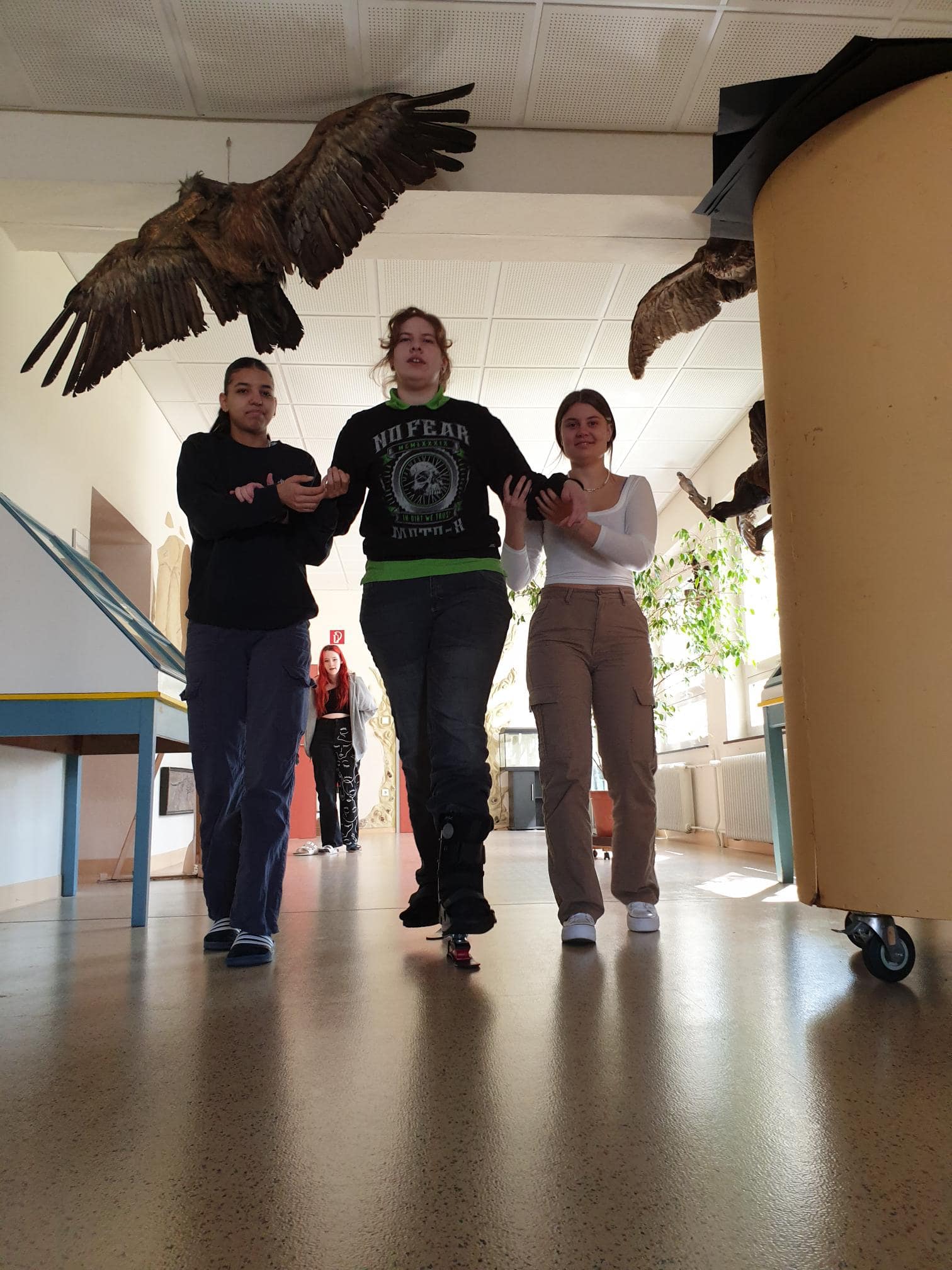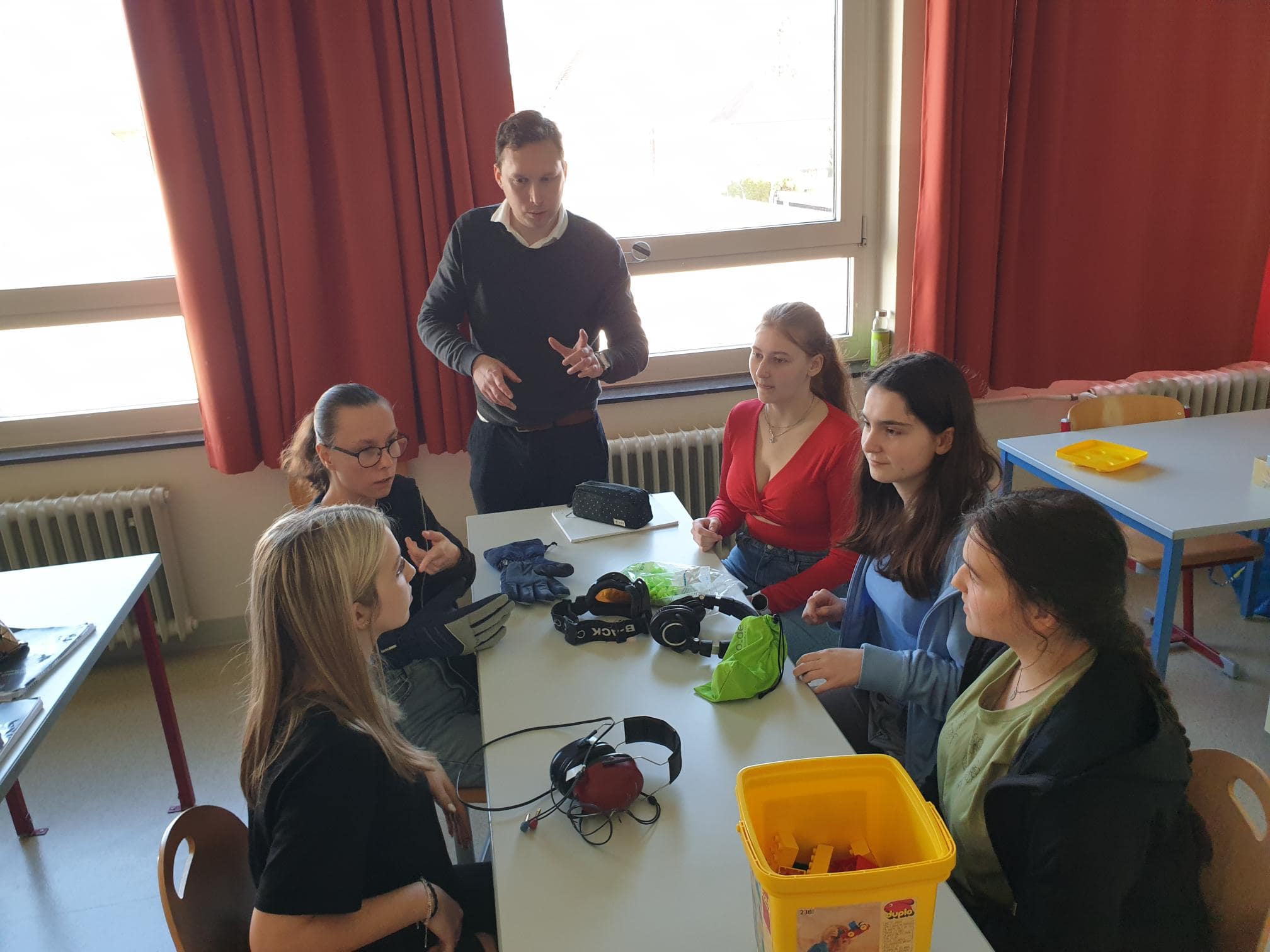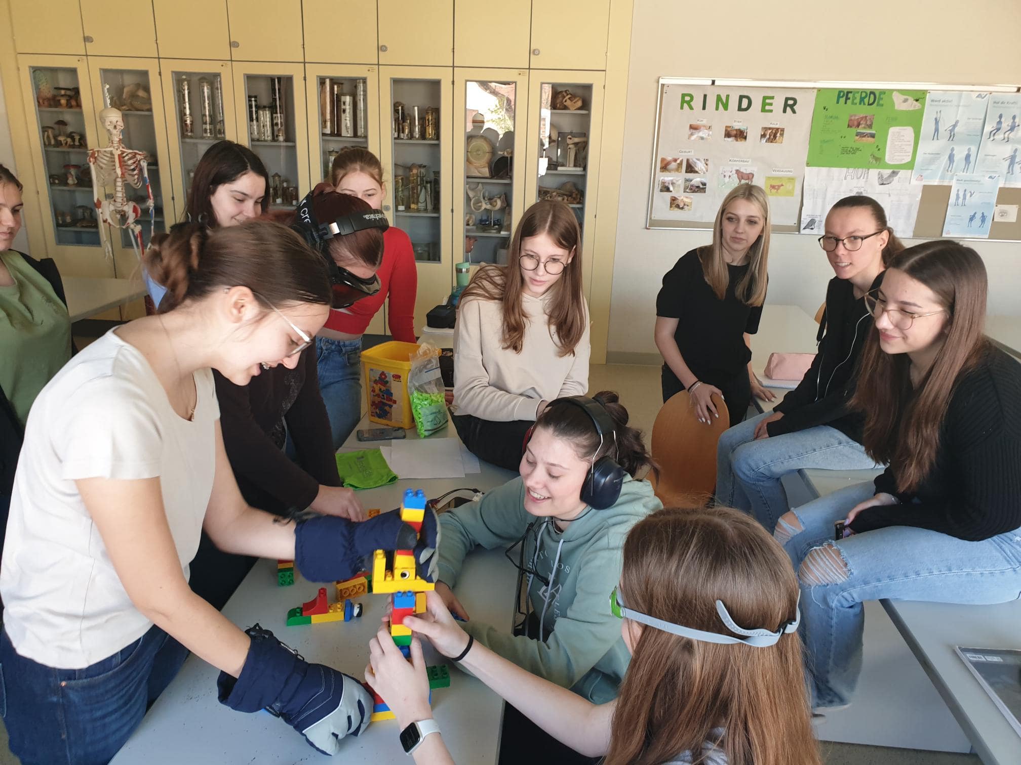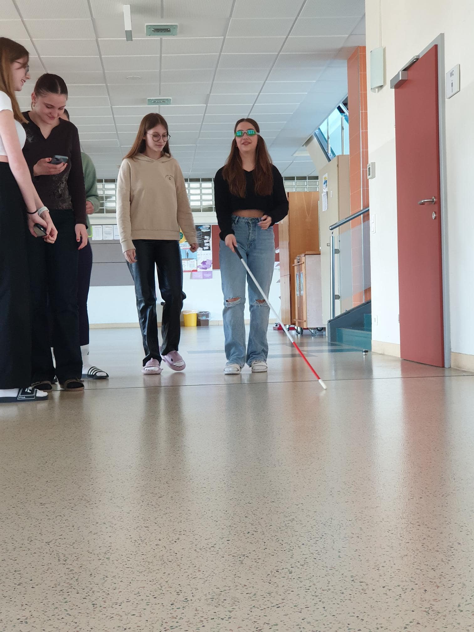 Anschließend durften wir selbst versuchen, mit einer simulierten Beeinträchtigung (z.B.: einer verdunkelten Brille) Bewegungen sowie Arbeitsaufgaben zu erleben. Wir konnten blind die Barrierefreiheit der Schule mit dem Blindenstock erkunden, Aufgabenstellungen mit einer Sinnesbeeinträchtigung lösen und mit „Prothesendummis“ umhergehen.