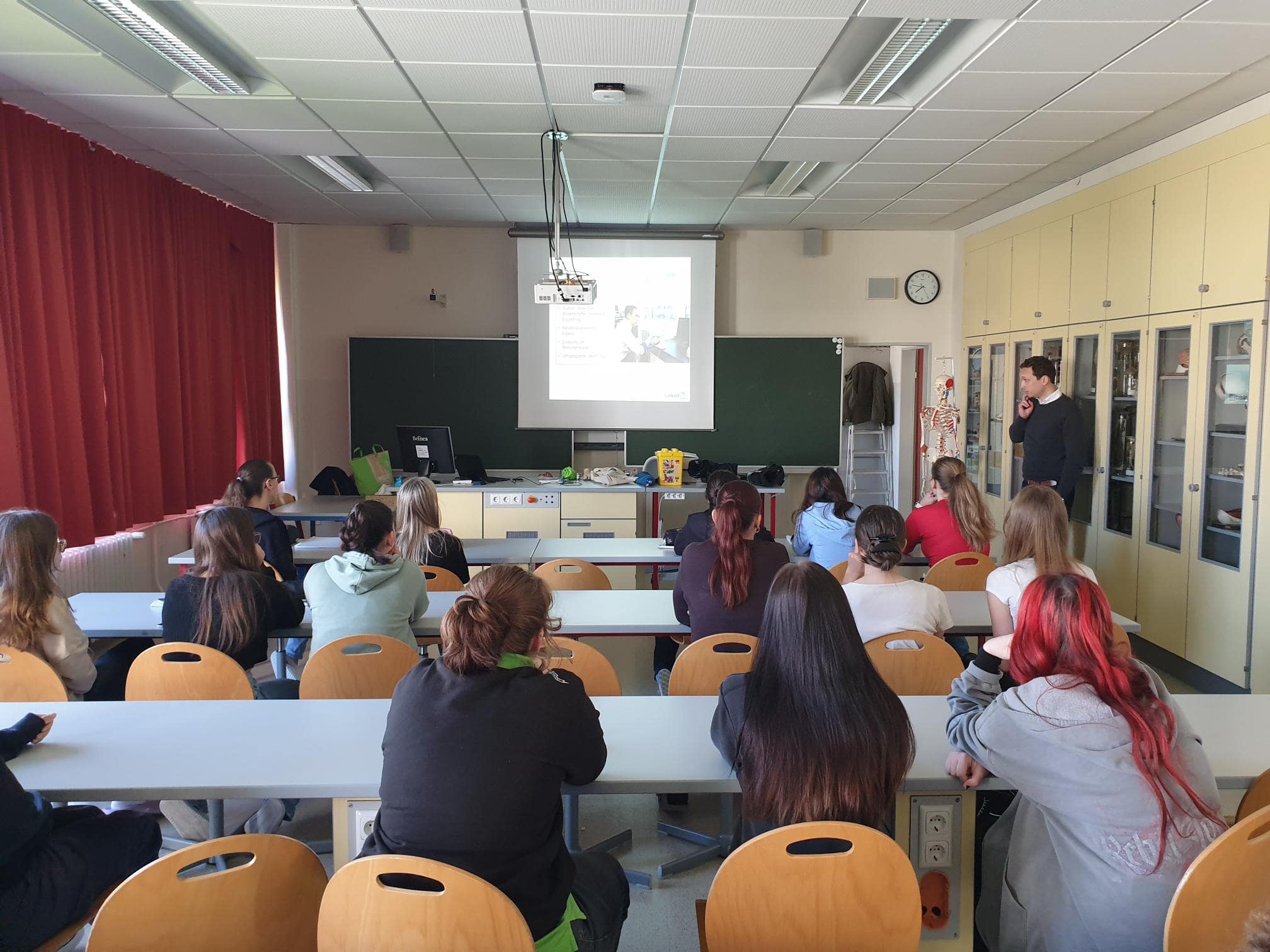 Der Themenschwerpunkt „Beeinträchtigungen/Behinderungen“ im Wahlpflichtfach Gesundheitslehre befasste sich mit Beeinträchtigungen auf medizinischer, psychologischer und sozialer Ebene. Im Rahmen dessen untersuchten wir, wie Personen mit Störungen der Sinneswahrnehmung, des Bewegungsapparates oder mit kognitiven Defiziten ihren Alltag bewältigen können. Hilfsmittel wie zum Beispiel Brillen, die barrierefreie Ausstattung von öffentlichen Gebäuden sowie Verkehrsmitteln und auch technische Ersatzteile wie Prothesen und Orthesen werden in diesem Themenblock erarbeitet. Anlässlich dieses Schwerpunktes besuchte uns am 21. April Dr. Matthias Scherer von der FH Technikum Wien. Er ist Hochschullektor an der Fachhochschule und Forschungsspezialist im Gebiet Rehabilitationstechnik mit dem Schwerpunkt Bewegungsanalyse, Prothetik und Biomechanik. In einem kurzen Vortrag hat er uns das breite Arbeitsfeld der Medizintechnik vorgestellt. Angefangen bei der Ecard, über die Telemedizin, den Defibrillator, die bildgebende Diagnostik bis hin zu Prothesen und vielen Bereiche mehr, reicht das interdisziplinäre Feld der Medizintechnik.