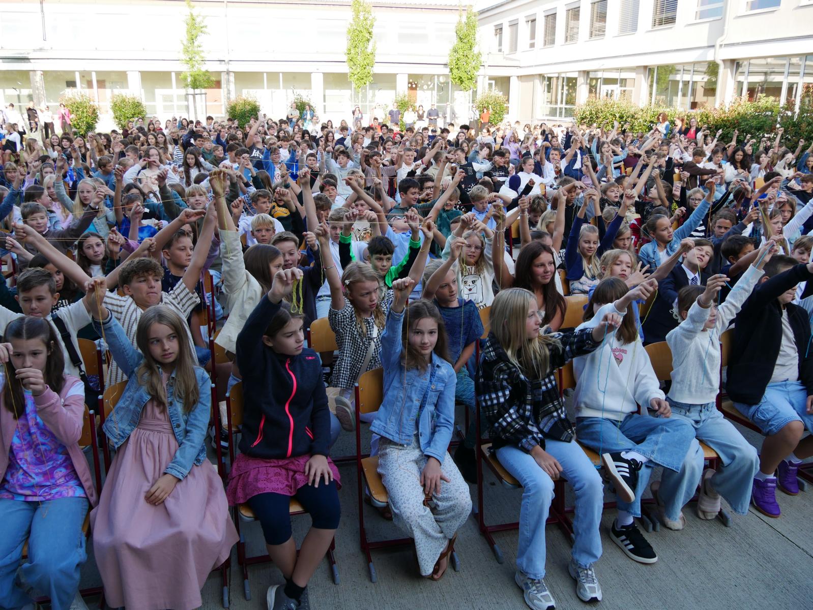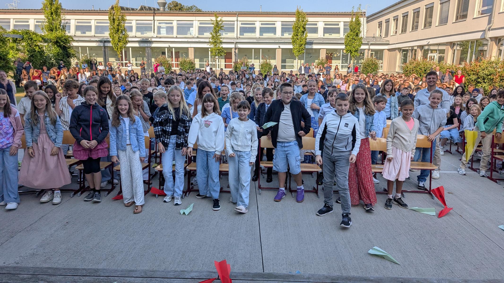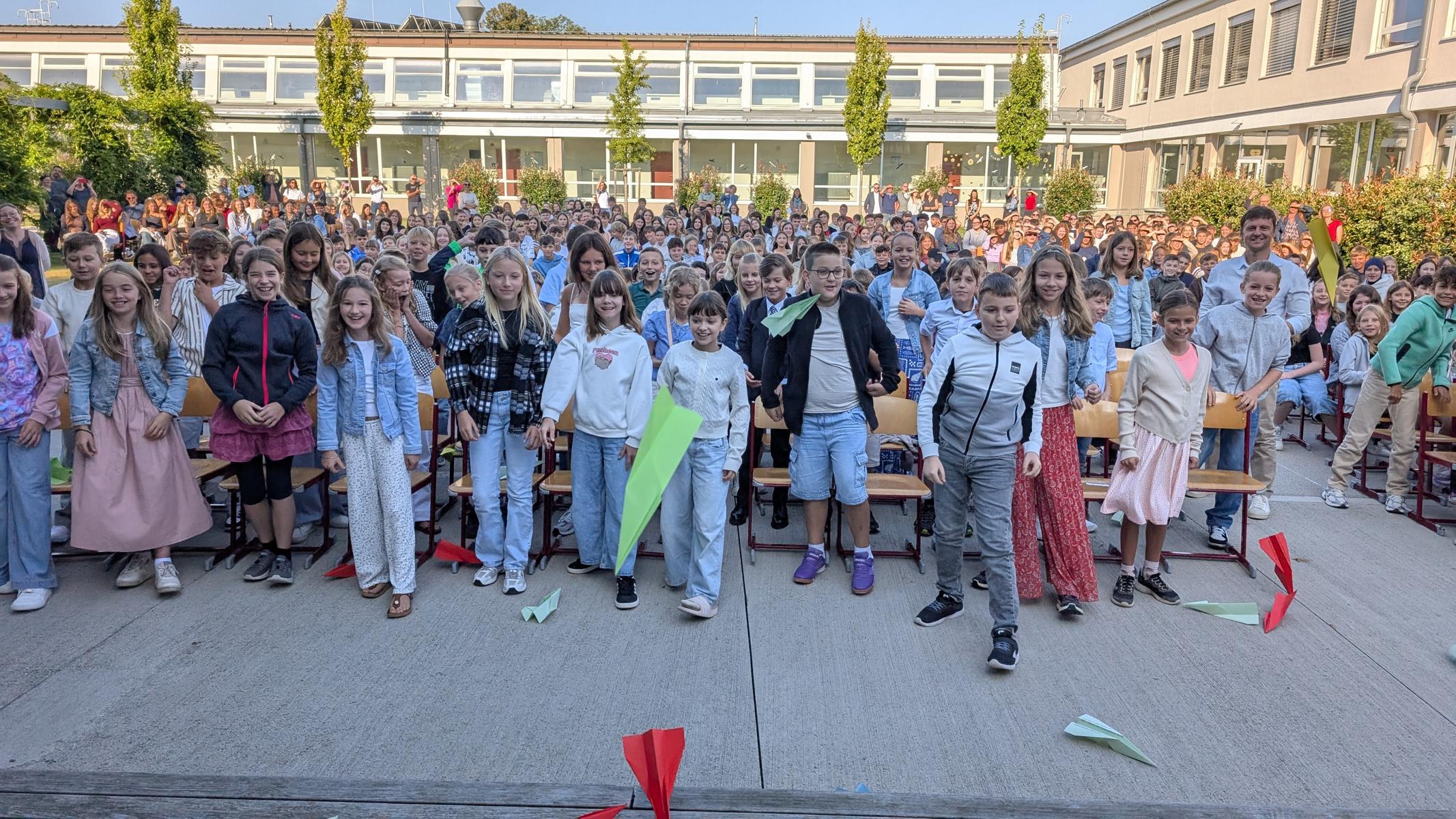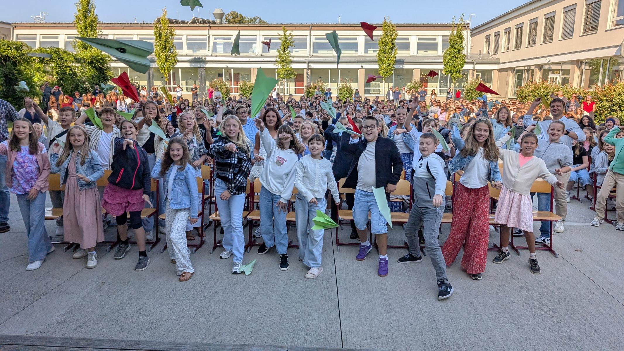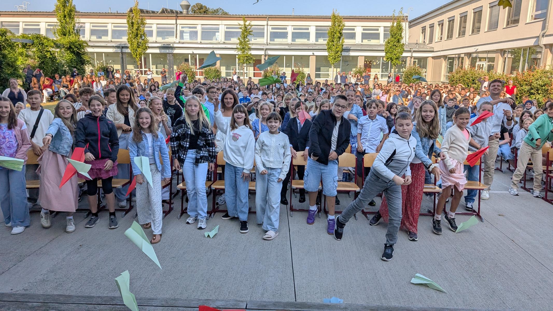 Ein besonderer Moment war die Begrüßung der Schüler:innen der ersten Klassen. Mit Unterstützung der gesamten Schulgemeinschaft durften sie symbolisch ihren Start ins Gymnasium feiern – mit einem lautstarker „Herzlich willkommen!“ und dem Start eines Begrüßungspapierfliegers, der ihre Reise durch die kommenden Schuljahre einläutete.