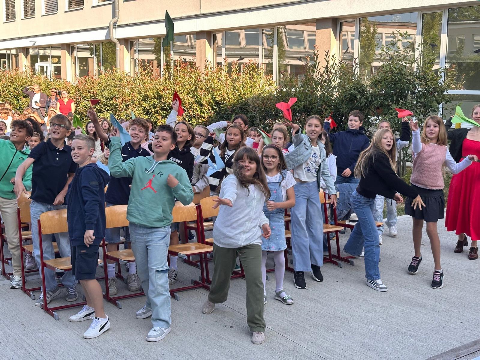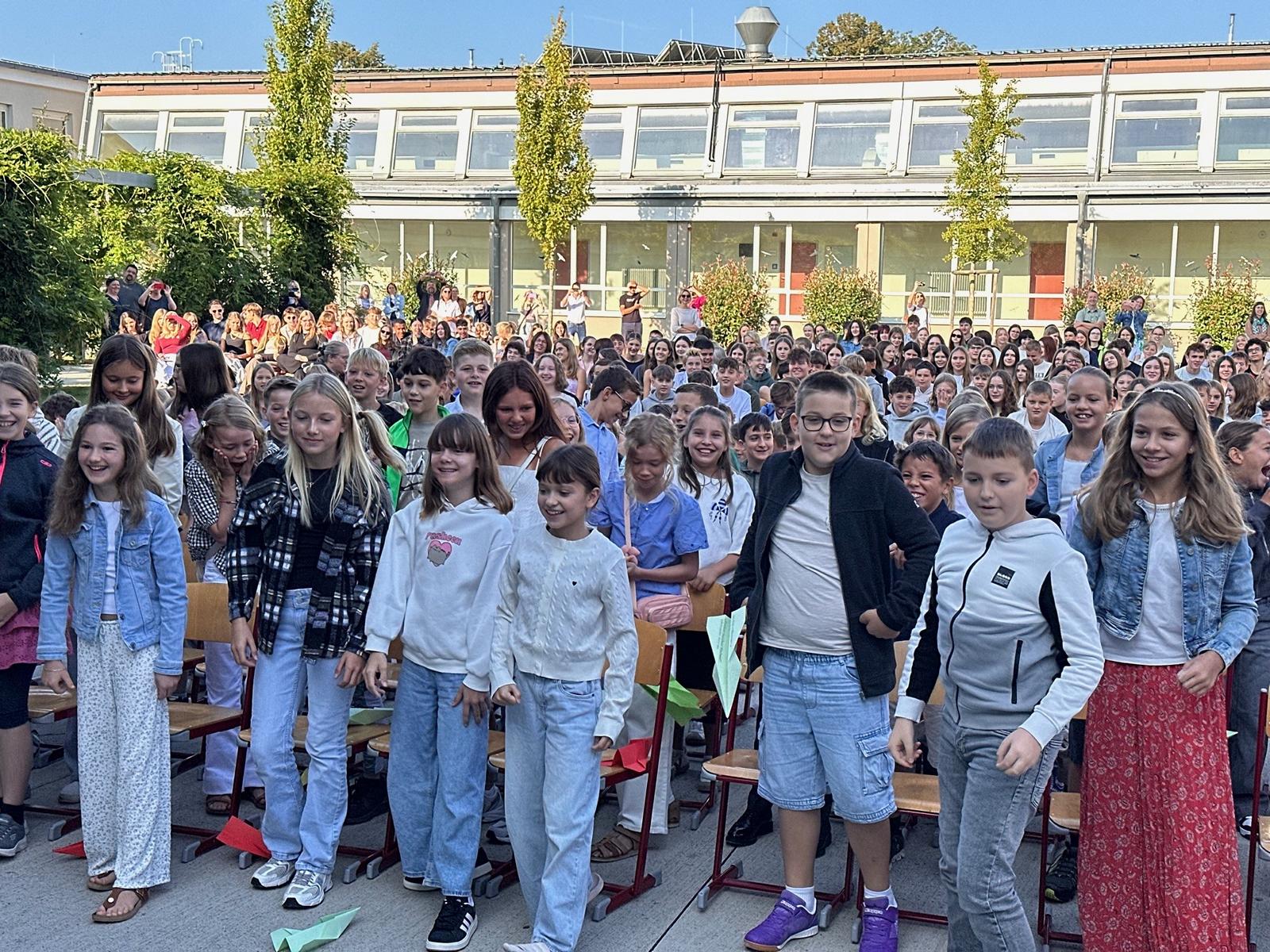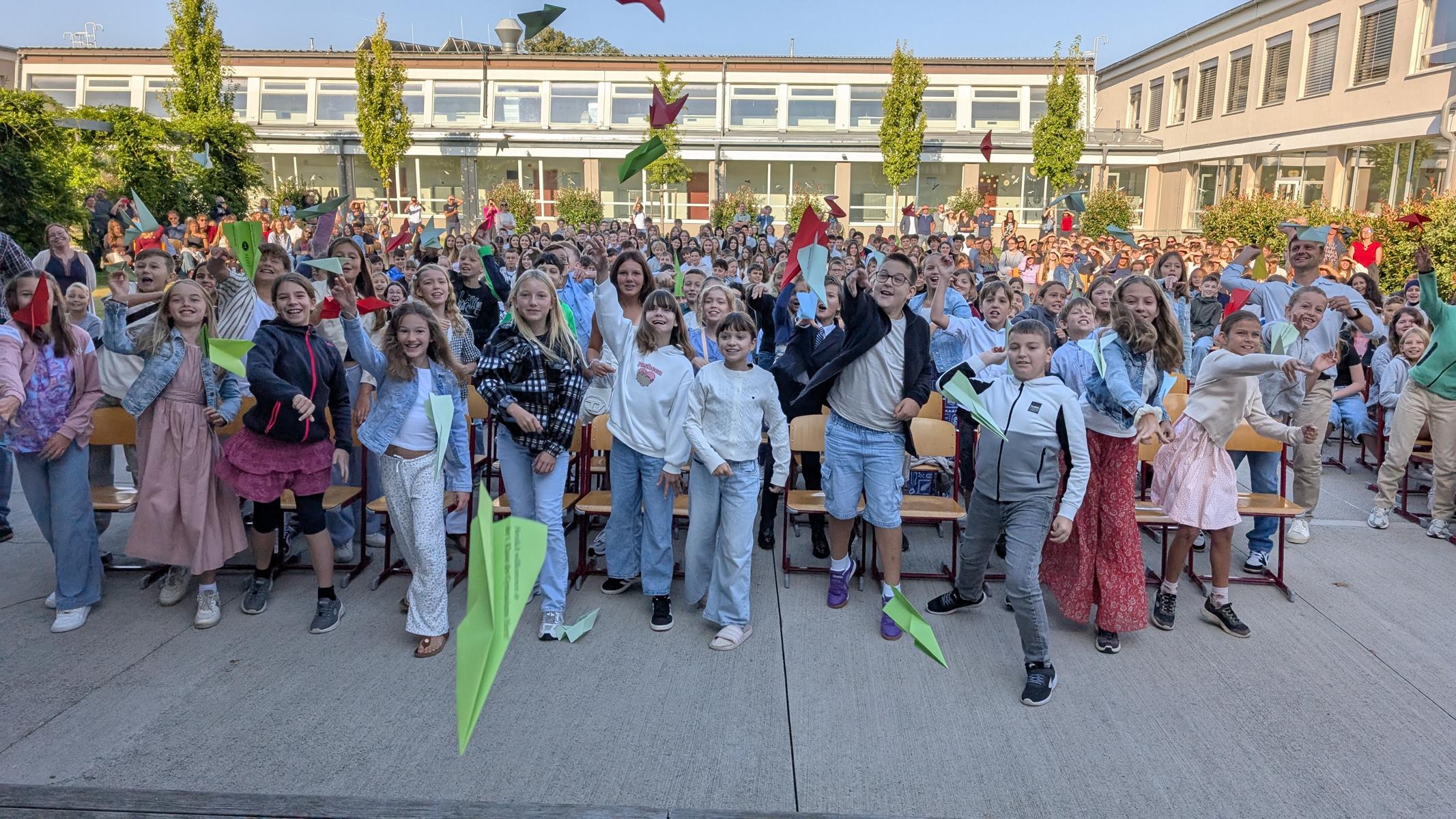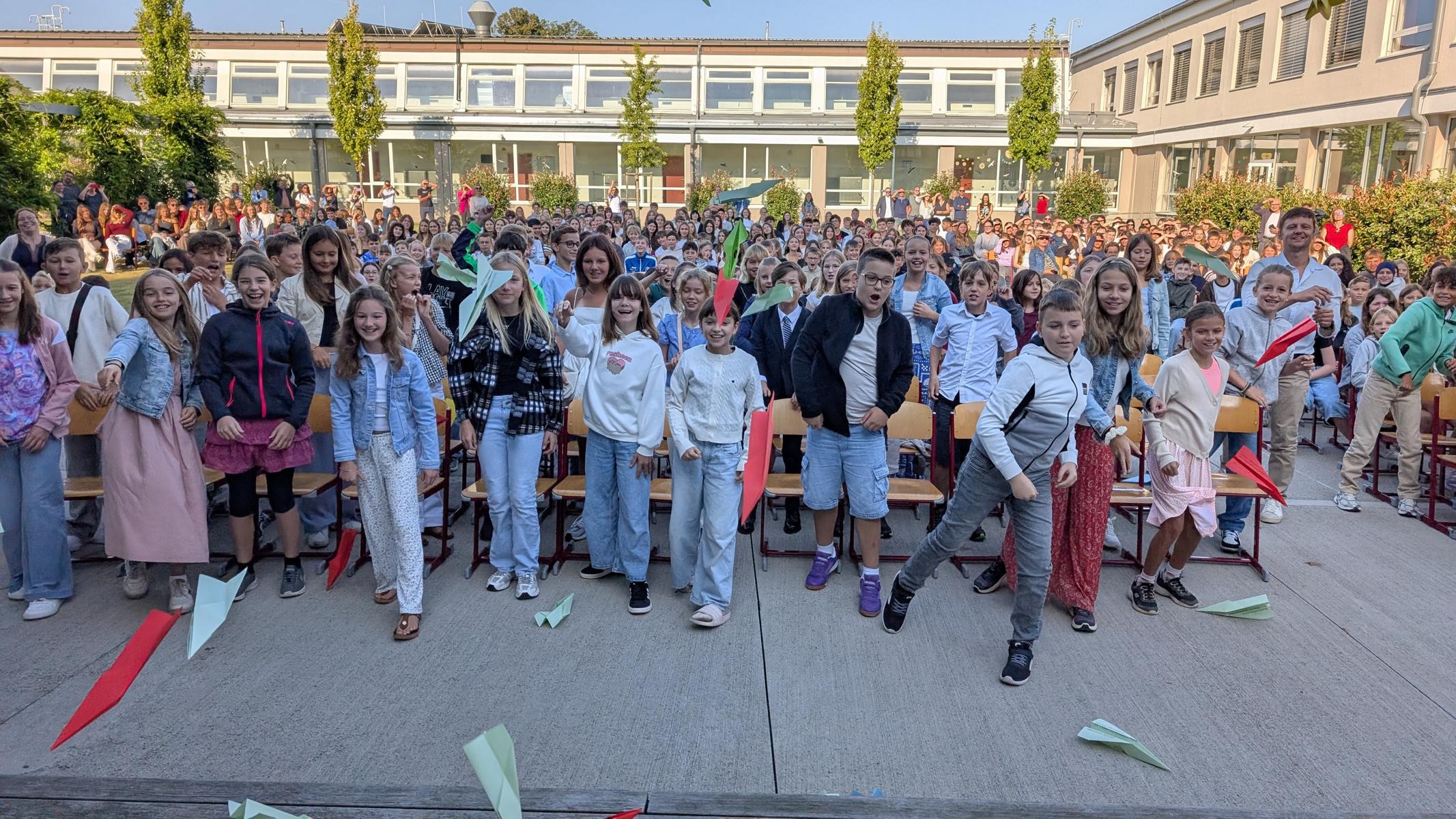 Ein besonderer Moment war die Begrüßung der Schüler:innen der ersten Klassen. Mit Unterstützung der gesamten Schulgemeinschaft durften sie symbolisch ihren Start ins Gymnasium feiern – mit einem lautstarker „Herzlich willkommen!“ und dem Start eines Begrüßungspapierfliegers, der ihre Reise durch die kommenden Schuljahre einläutete.