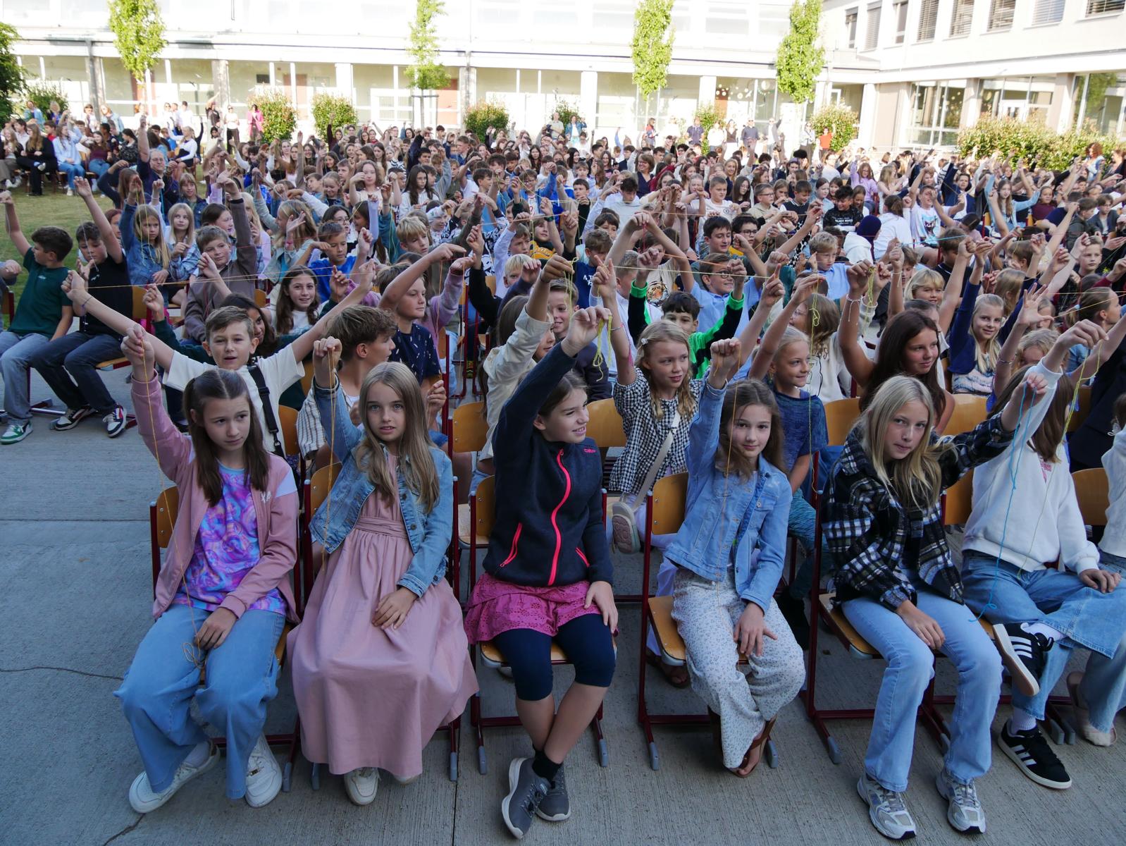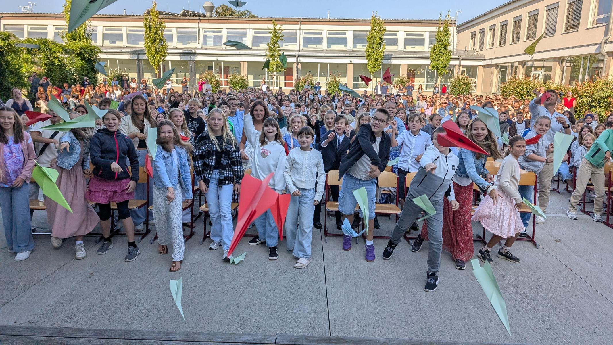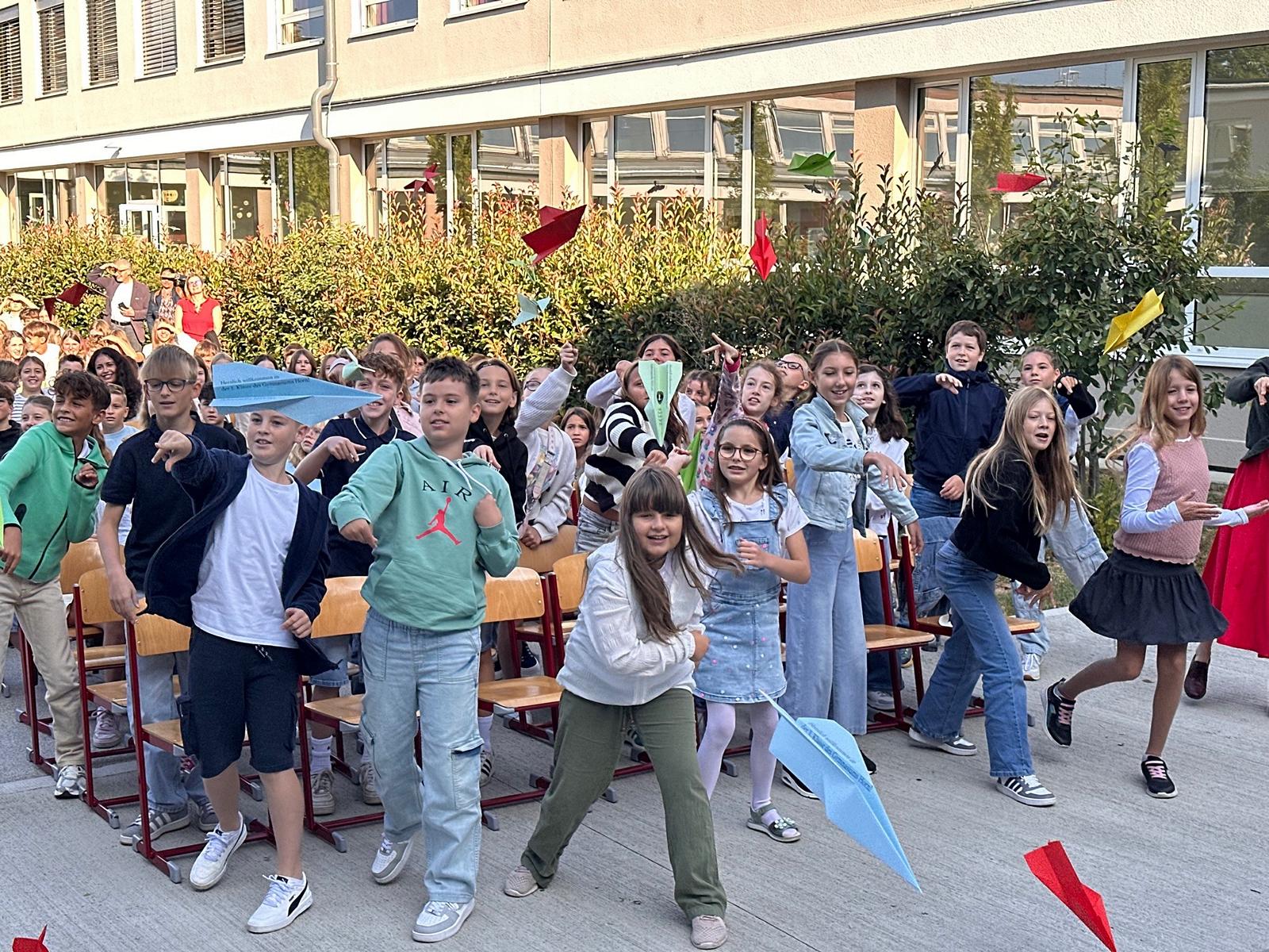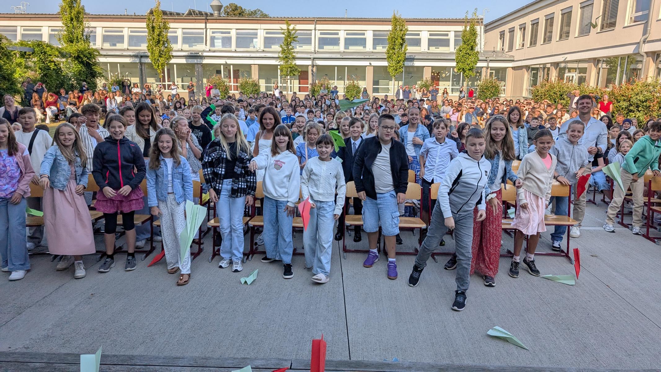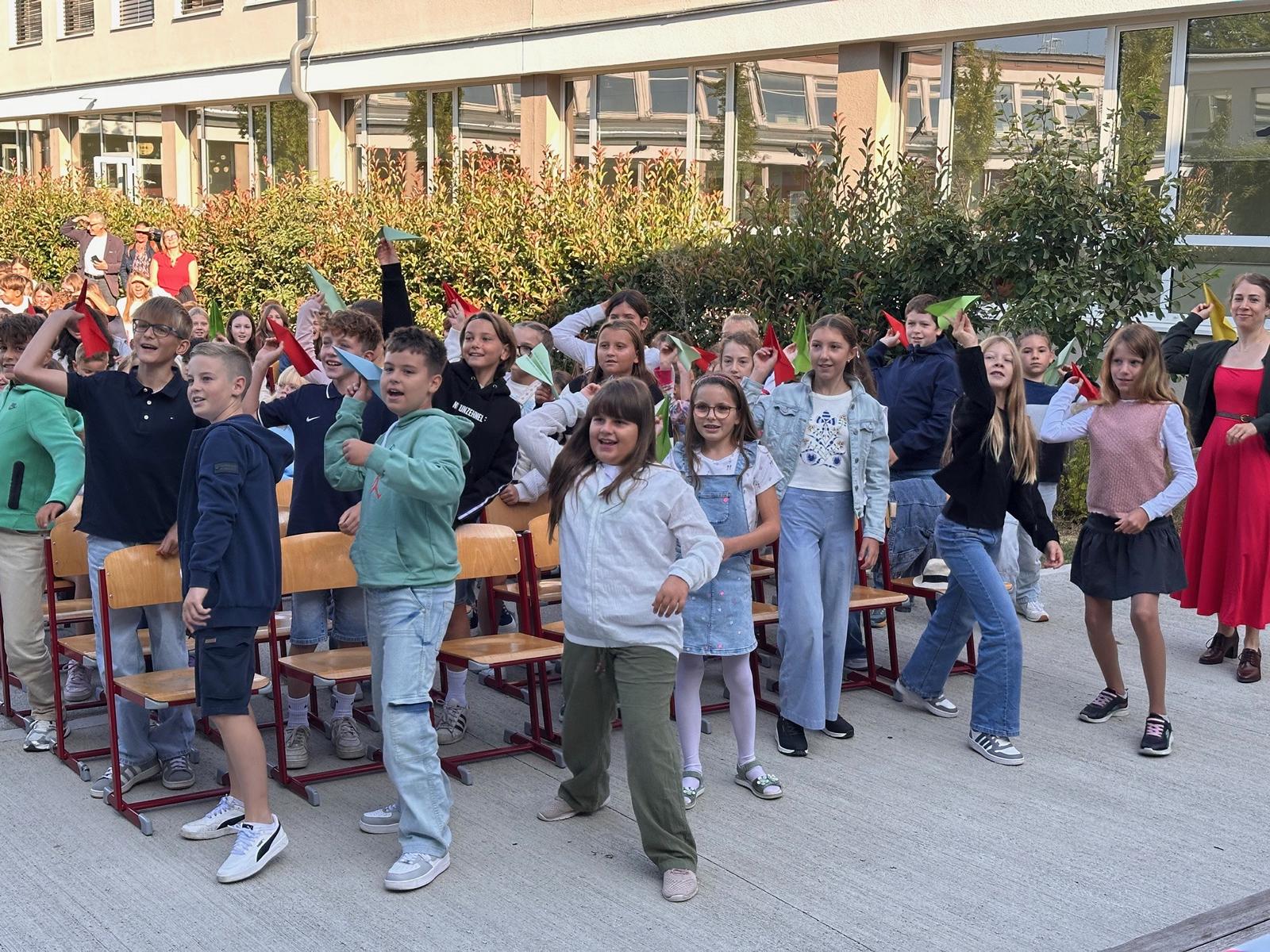 Ein besonderer Moment war die Begrüßung der Schüler:innen der ersten Klassen. Mit Unterstützung der gesamten Schulgemeinschaft durften sie symbolisch ihren Start ins Gymnasium feiern – mit einem lautstarker „Herzlich willkommen!“ und dem Start eines Begrüßungspapierfliegers, der ihre Reise durch die kommenden Schuljahre einläutete.
