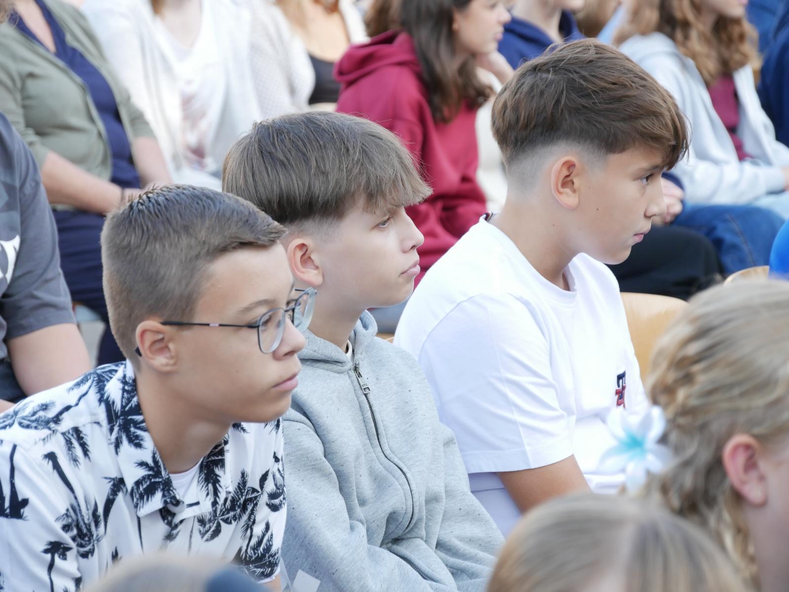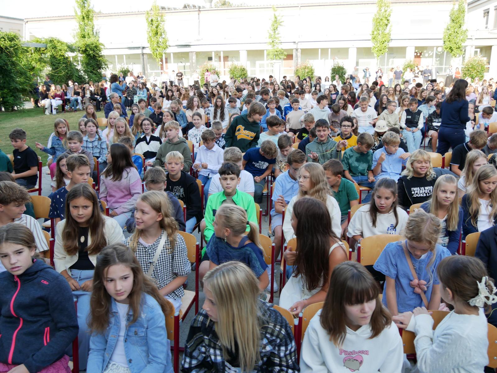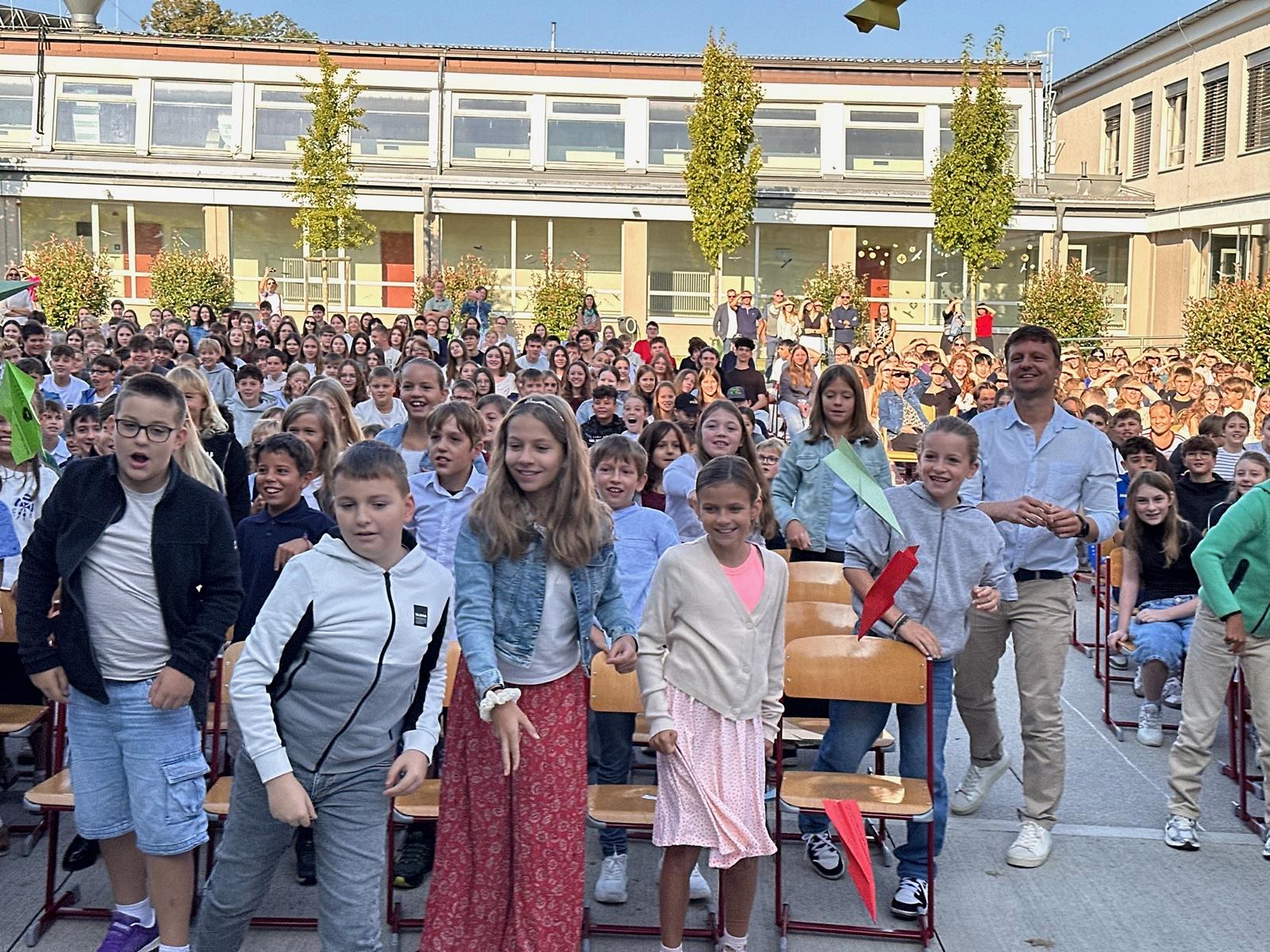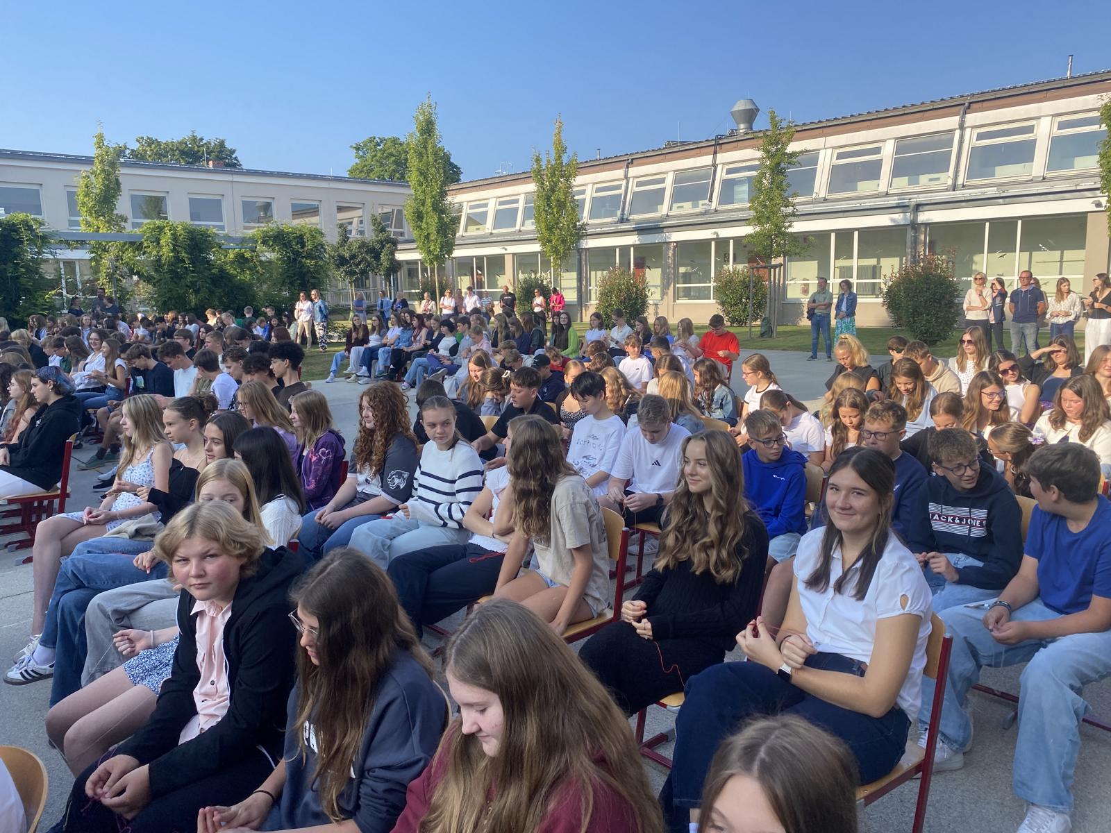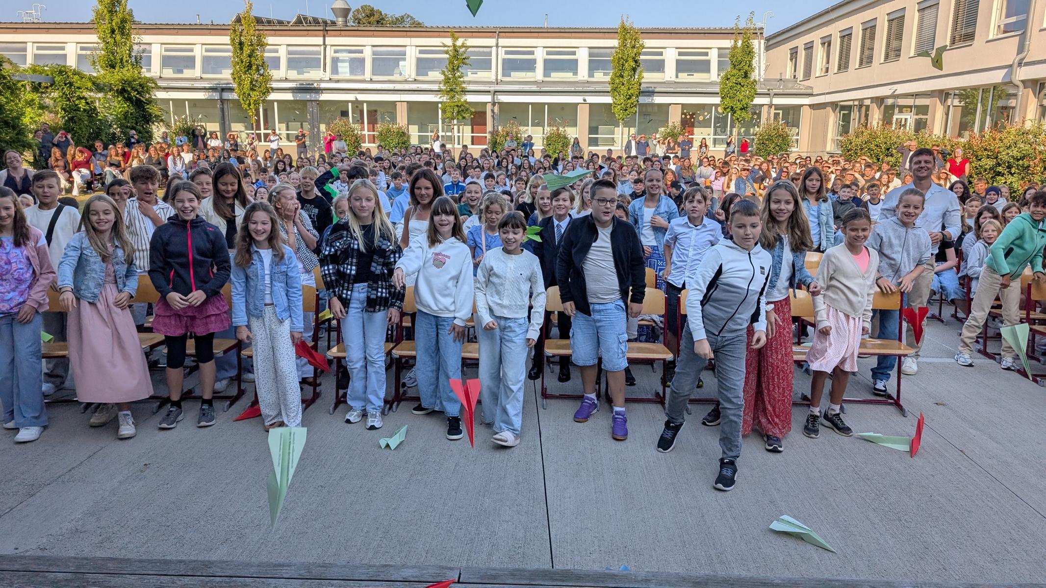 Ein besonderer Moment war die Begrüßung der Schüler:innen der ersten Klassen. Mit Unterstützung der gesamten Schulgemeinschaft durften sie symbolisch ihren Start ins Gymnasium feiern – mit einem lautstarker „Herzlich willkommen!“ und dem Start eines Begrüßungspapierfliegers, der ihre Reise durch die kommenden Schuljahre einläutete.