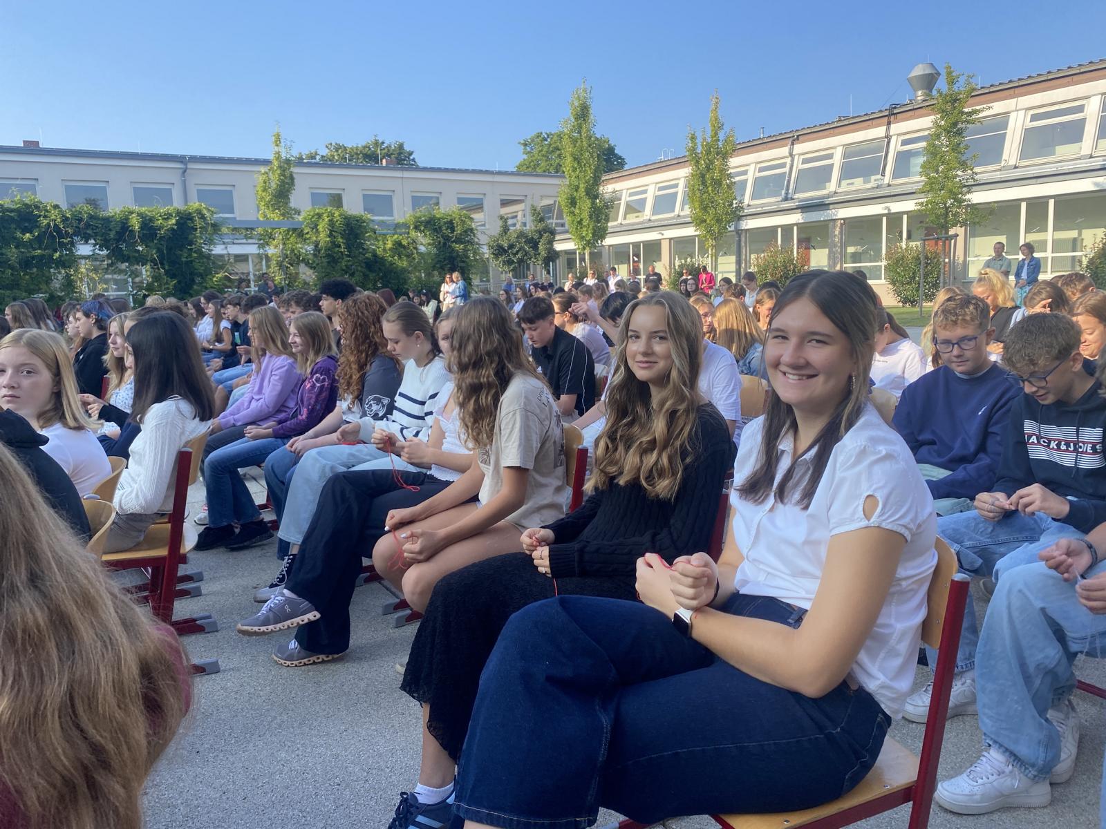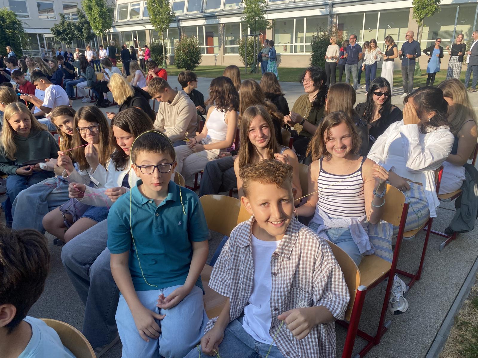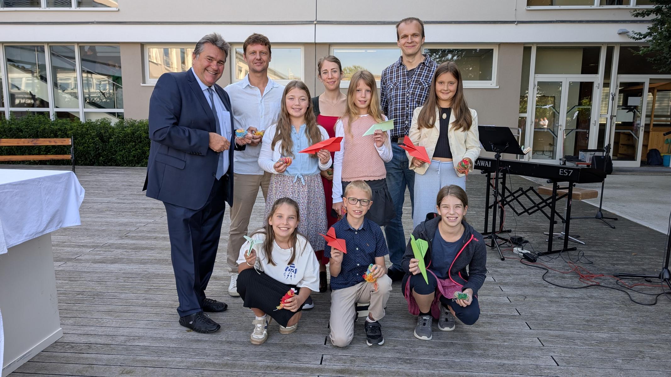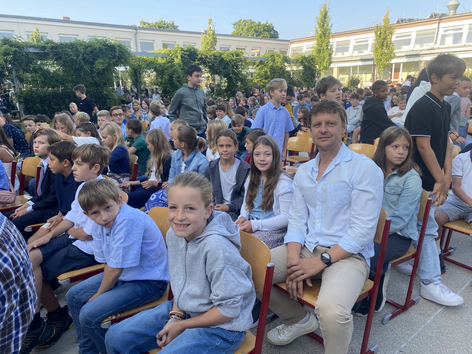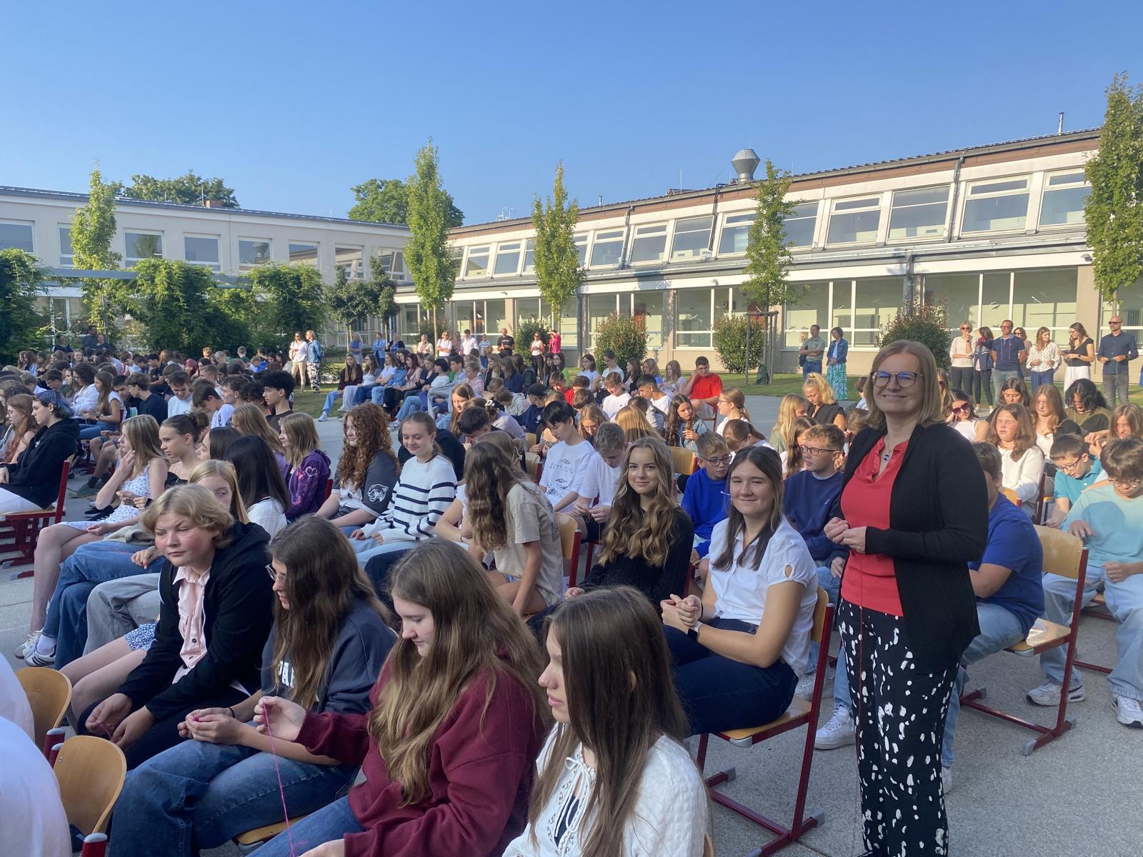 Ein besonderer Moment war die Begrüßung der Schüler:innen der ersten Klassen. Mit Unterstützung der gesamten Schulgemeinschaft durften sie symbolisch ihren Start ins Gymnasium feiern – mit einem lautstarker „Herzlich willkommen!“ und dem Start eines Begrüßungspapierfliegers, der ihre Reise durch die kommenden Schuljahre einläutete.