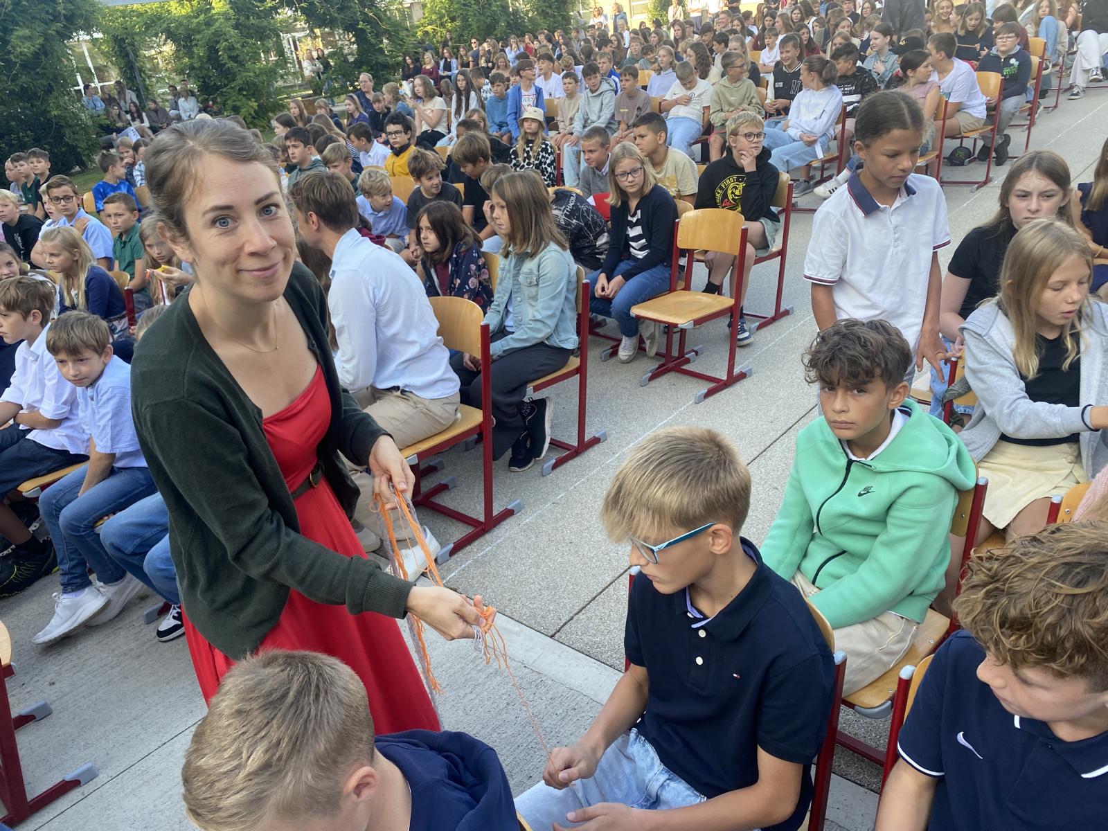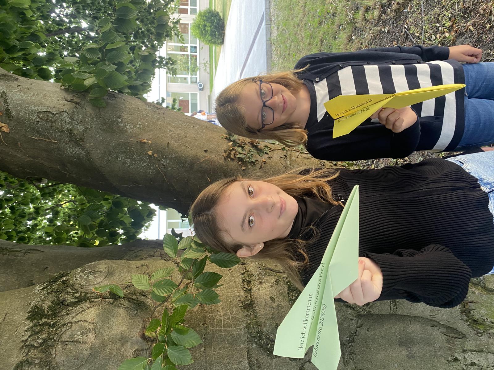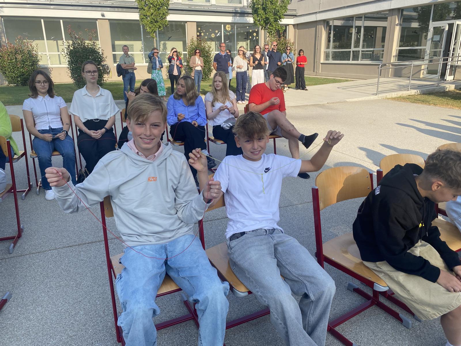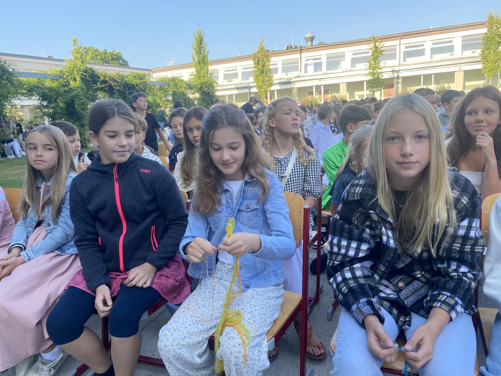 Ein besonderer Moment war die Begrüßung der Schüler:innen der ersten Klassen. Mit Unterstützung der gesamten Schulgemeinschaft durften sie symbolisch ihren Start ins Gymnasium feiern – mit einem lautstarker „Herzlich willkommen!“ und dem Start eines Begrüßungspapierfliegers, der ihre Reise durch die kommenden Schuljahre einläutete.