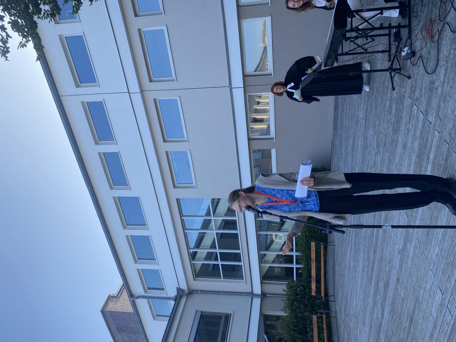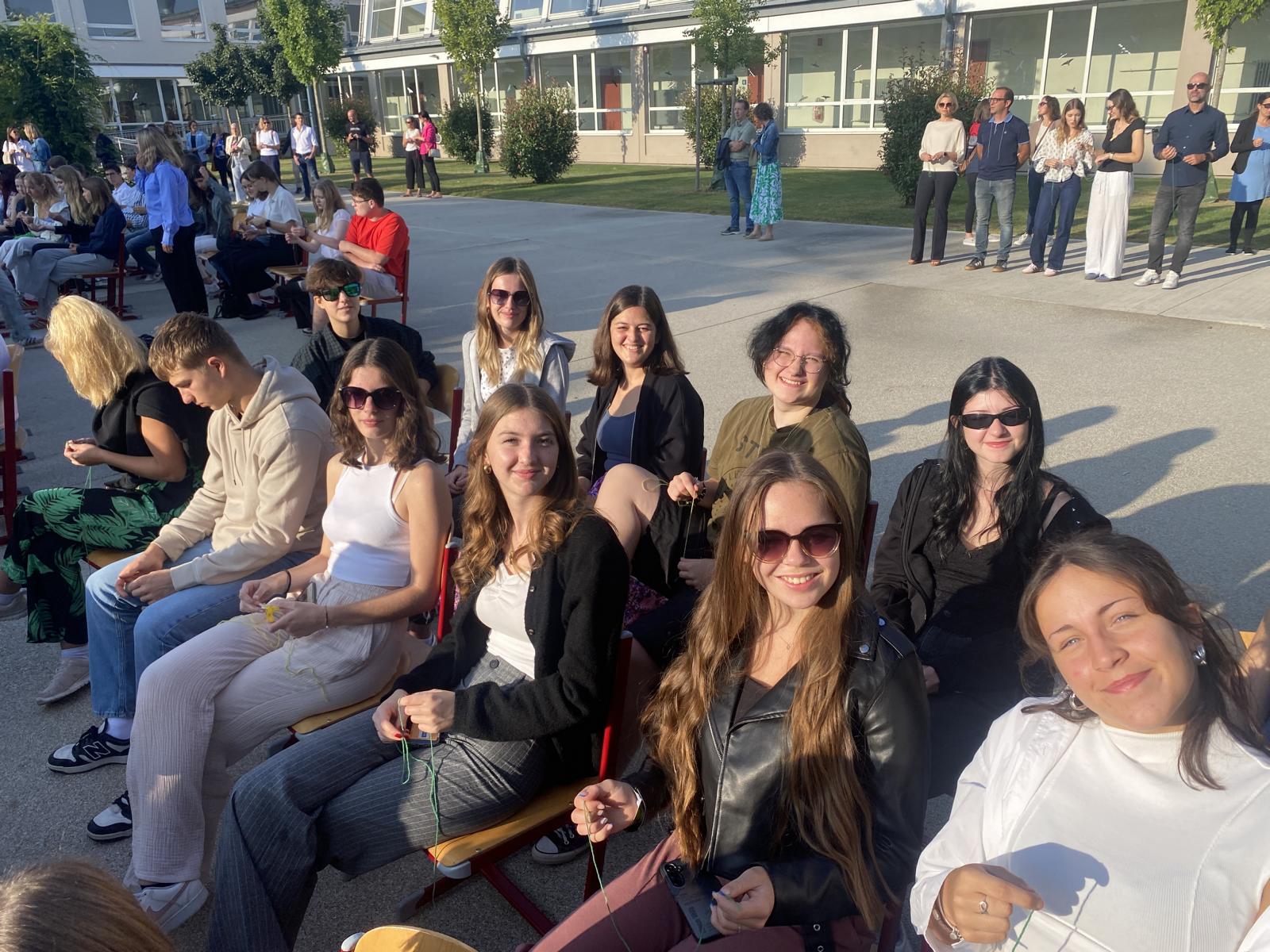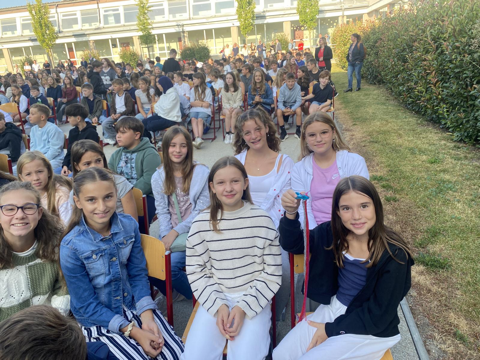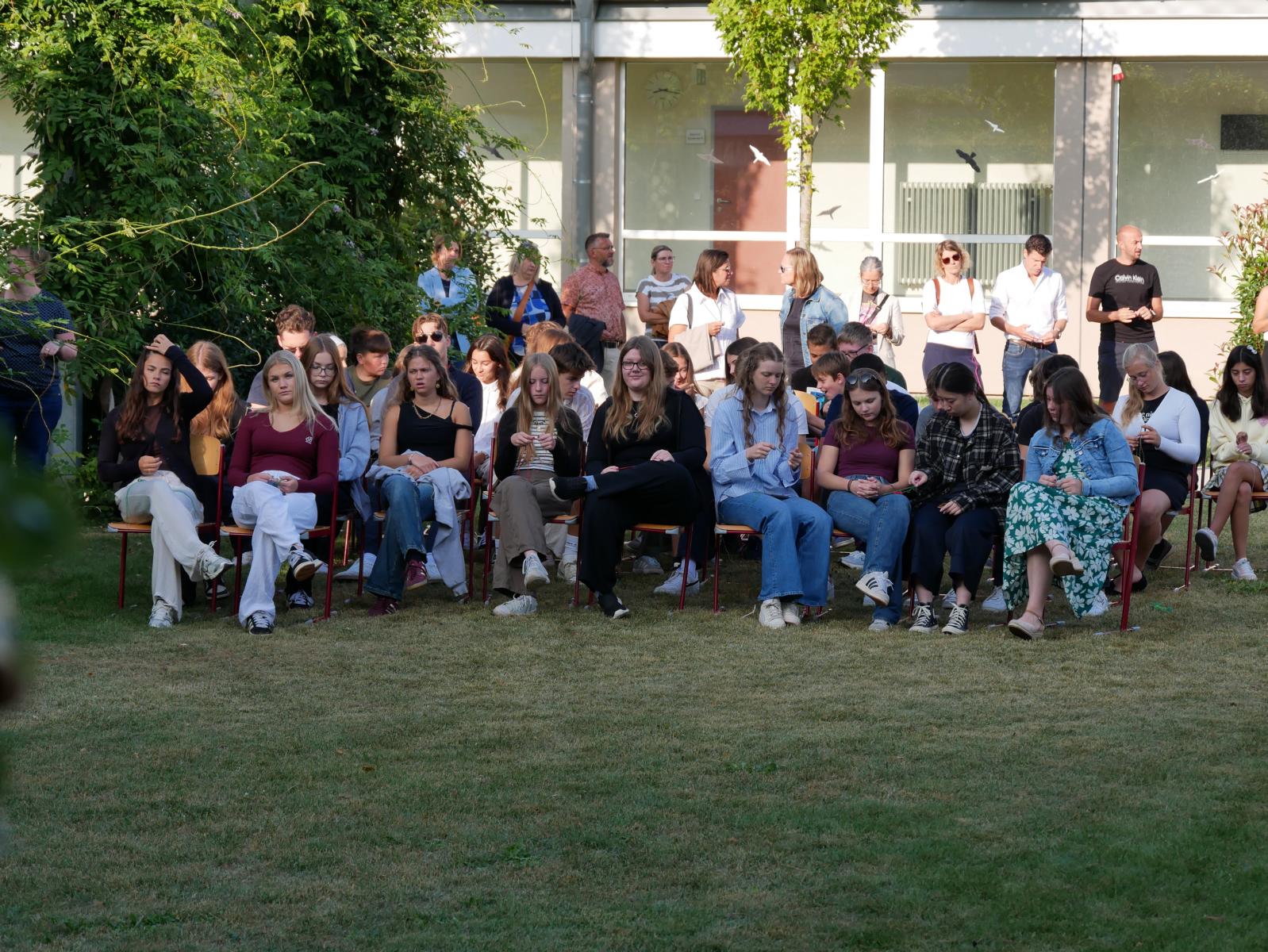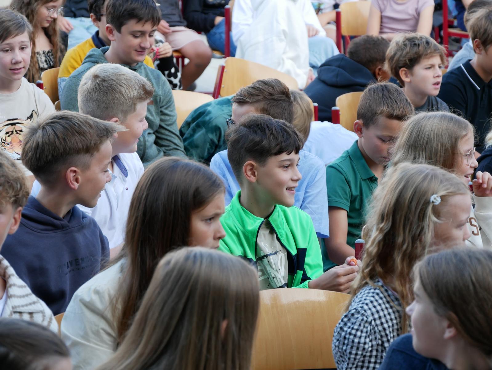 Ein besonderer Moment war die Begrüßung der Schüler:innen der ersten Klassen. Mit Unterstützung der gesamten Schulgemeinschaft durften sie symbolisch ihren Start ins Gymnasium feiern – mit einem lautstarker „Herzlich willkommen!“ und dem Start eines Begrüßungspapierfliegers, der ihre Reise durch die kommenden Schuljahre einläutete.
