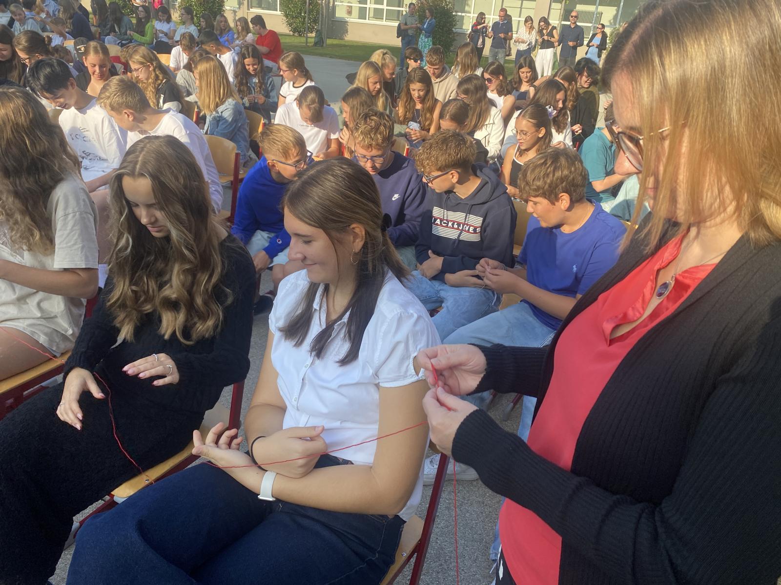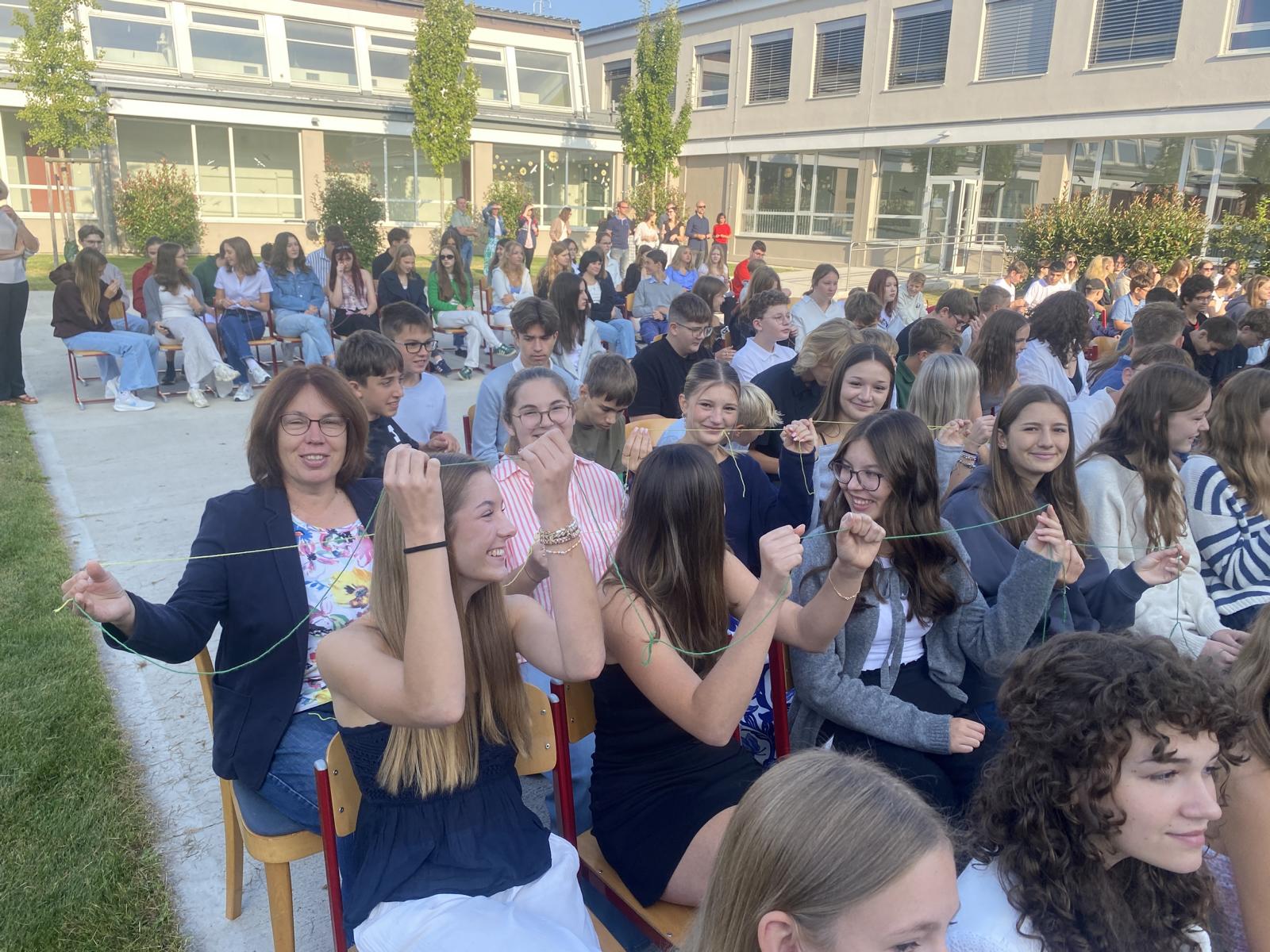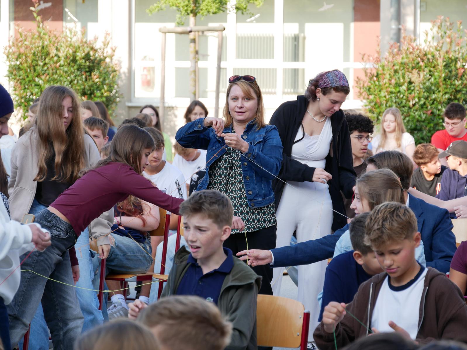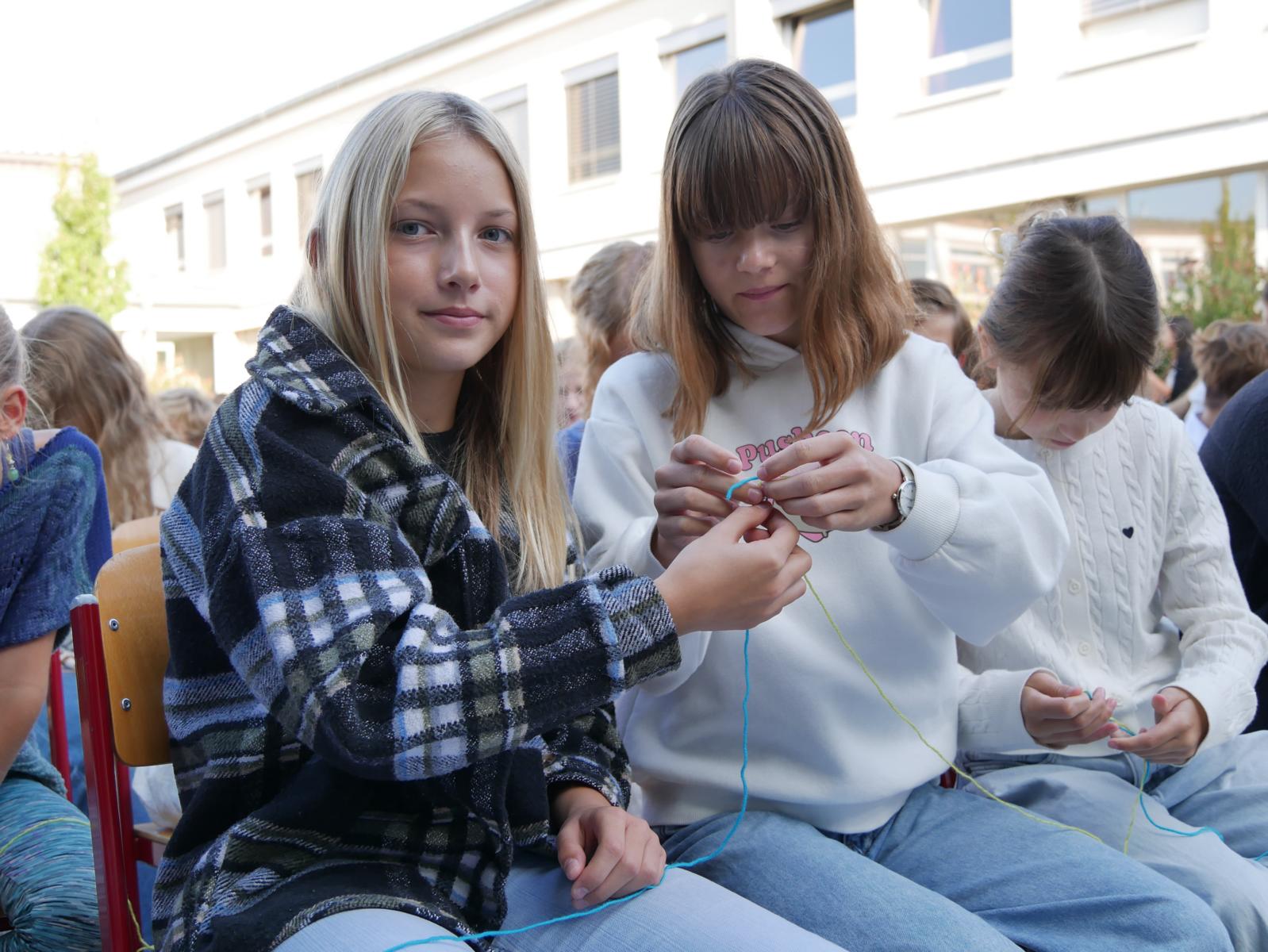 Als Symbol für Vielfalt und Zusammenhalt erhielt jede und jeder von Pfarrerin Birgit Schiller oder den anderen Religionslehrern ein Stück bunten Wollfaden. Die Farben waren so unterschiedlich wie die Menschen, die sie hielten – und doch wurden alle Fäden zu einer langen Schnur verknüpft. Ein starkes Zeichen: Wir sind verschieden, aber wir gehören zusammen.