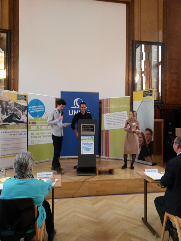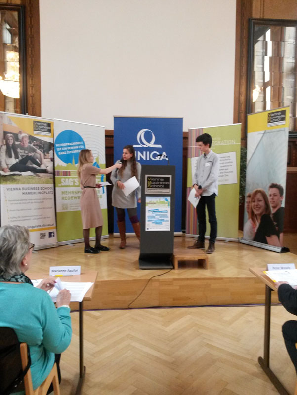 Ein Schüler und eine Schülerin der 7B Klasse, Taha Al Kashmany und Denise Ponholzer, nahmen am mehrsprachigen Redewettbewerb Sag’s Multi teil. Diesjähriger Austragungsort war die Vienna Business School in Wien. Beide präsentierten ihre überaus gelungenen Reden in deutscher und englischer Sprache zu den Themen „Ungerechtigkeit an irgendeinem Ort bedroht die Gerechtigkeit an jedem anderen." (Martin Luther King) (Denise Ponholzer) und „Freiheit beginnt im Kopf“ (Taha Al Kashmany) souverän vor der Jury und versammeltem Publikum und stellten so ihre rhetorischen und sprachlichen Fähigkeiten unter Beweis. Wir gratulieren dazu recht herzlich und möchten besonders Taha Al Kashmany zum Aufstieg in die Finalrunde beglückwünschen.