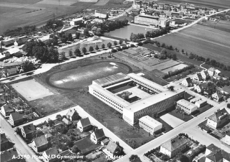 1961 Eröffnung des neuen Gymnasialgebäudes am nördlichen Stadtrand in der Puechhaim-Gasse. Die Stadtgemeinde Horn hat den Baugrund im Ausmaß von 30 000 m² im Wert von drei Millionen Schilling gratis zur Verfügung gestellt; der Bund wendet für den Bau rund 25 Millionen Schilling auf.